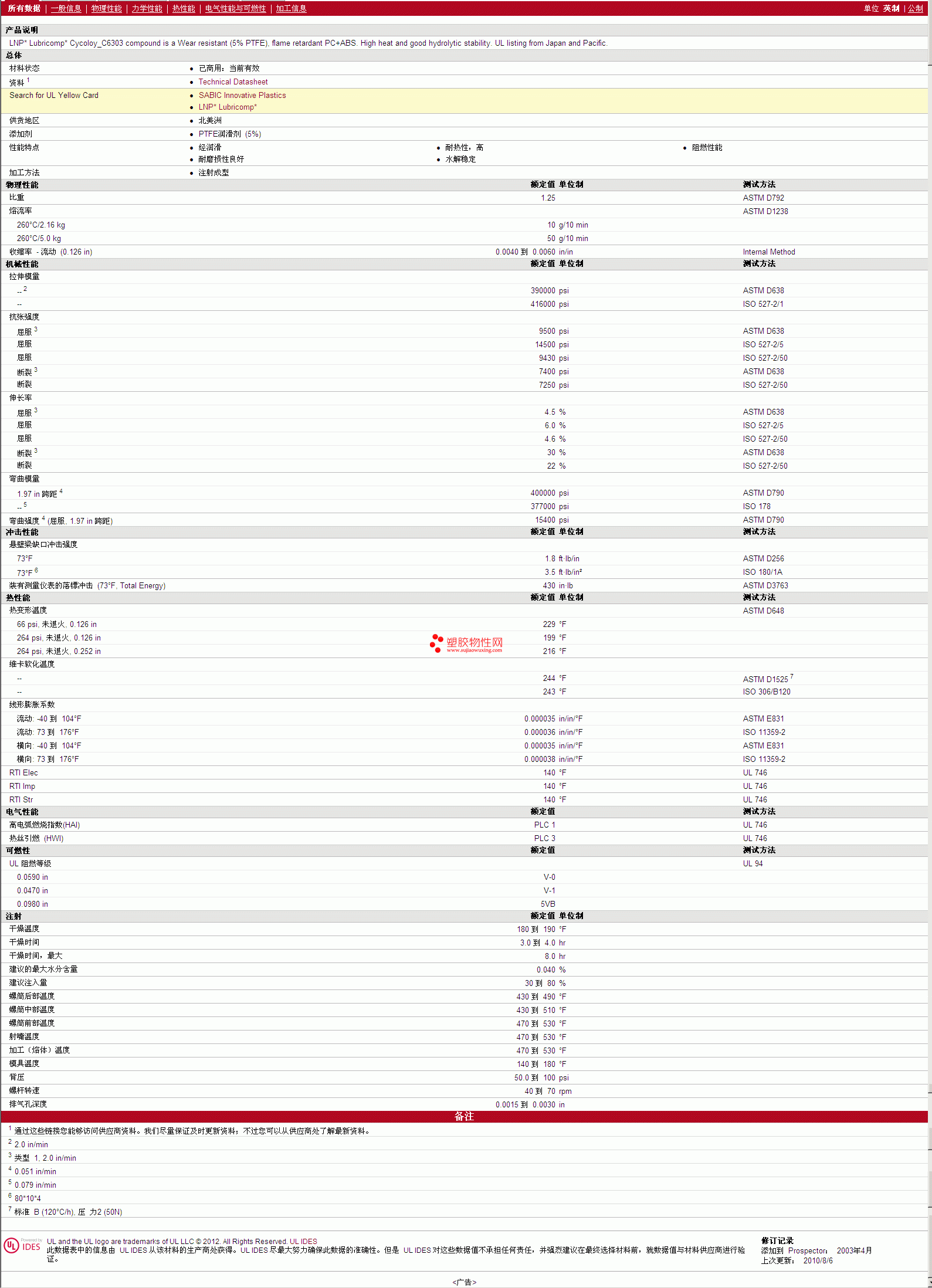如需了解LNP Lubricomp PTFE Cycoloy C6303 物性表更多详情,ROHS(SGS)报告、物质安全资料表(MSDS)、材质证明、UL黄卡等,最新行情报价等可来电咨询:赵先生:13424755533或QQ: 27660005
