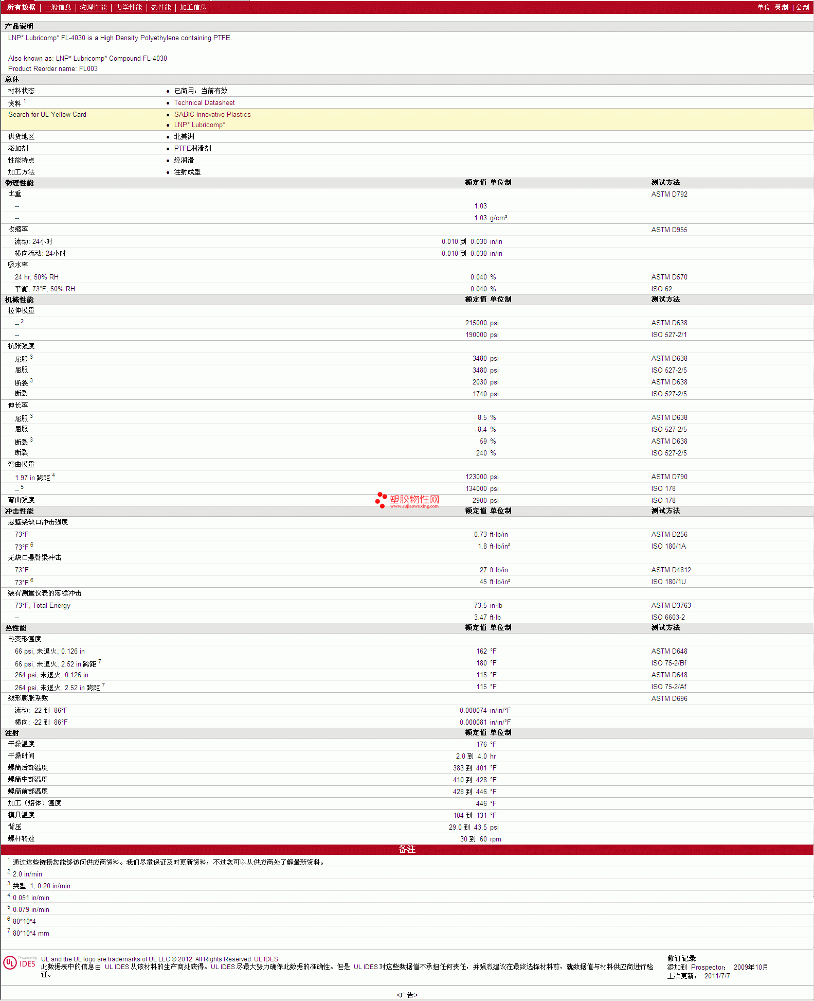 如需了解LNP Lubricomp PTFE FL003 物性表更多详情,ROHS(SGS)报告、物质安全资料表(MSDS)、材质证明、UL黄卡等,最新行情报价等可来电咨询:赵先生:13424755533或QQ: 27660005