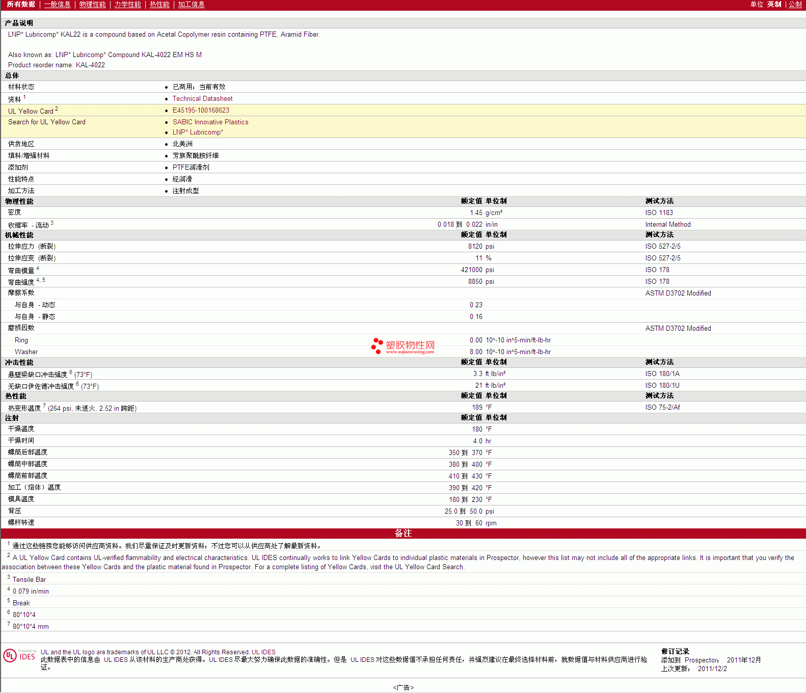更多LNP Lubricomp PTFE KAL22 物性表报价,图片、材质证明、UL黄卡、物质安全资料表(MSDS)等可来电咨询赵先生:13424755533或QQ: 27660005