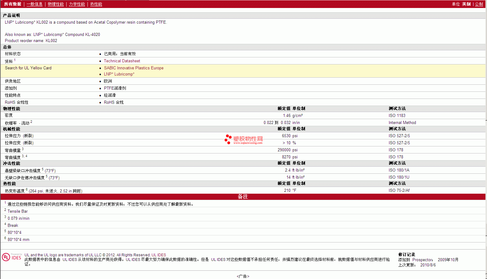 更多 LNP Lubricomp PTFE KL002 物性表报价,图片、材质证明、UL黄卡、物质安全资料表(MSDS)等,最新行情报价等可来电咨询赵先生:13424755533或QQ: 27660005