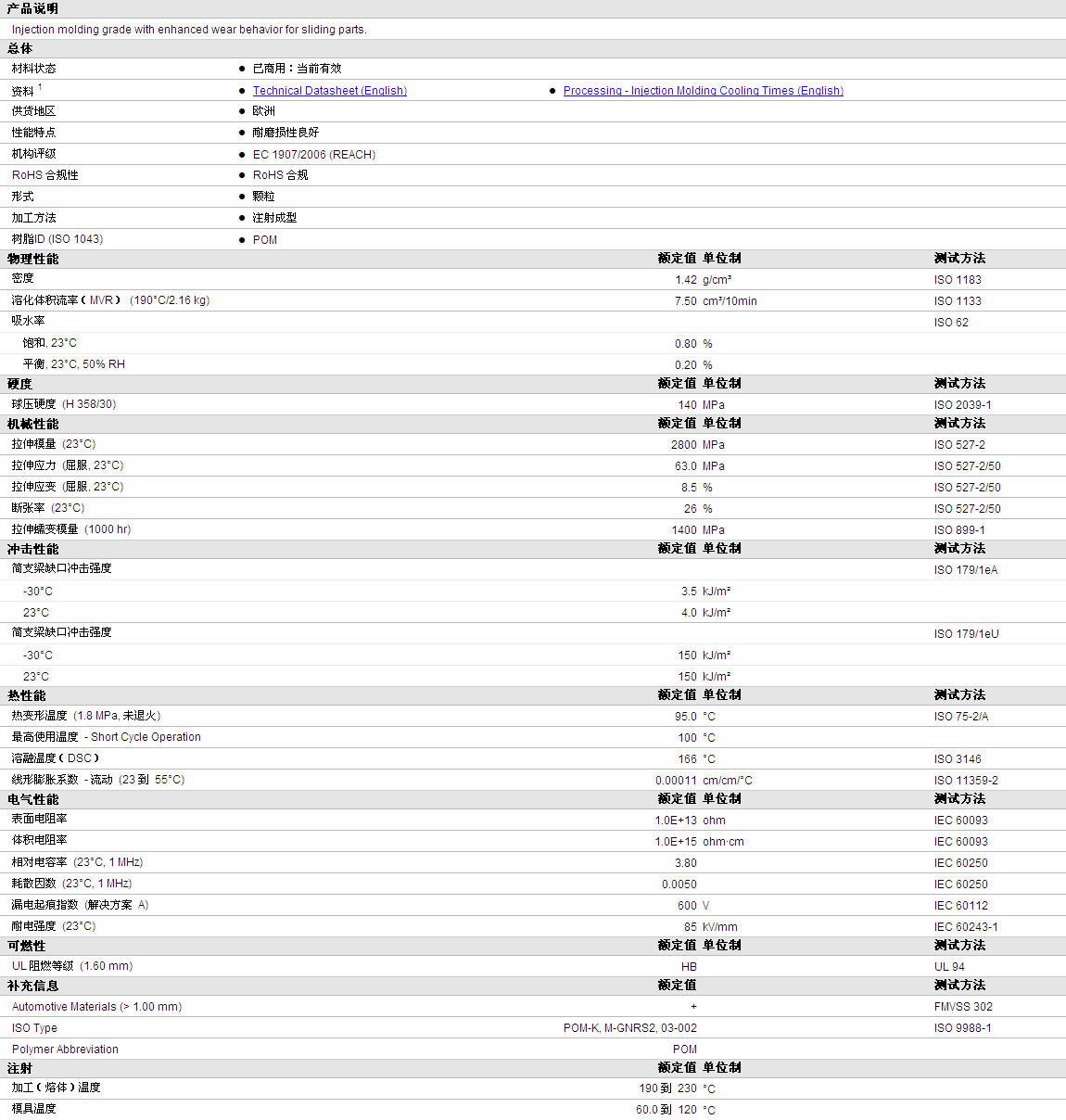 | 溶化体积流率(MVR) (190°C/2.16 kg) | 7.50 | cm³/10min | ISO 1133 |
