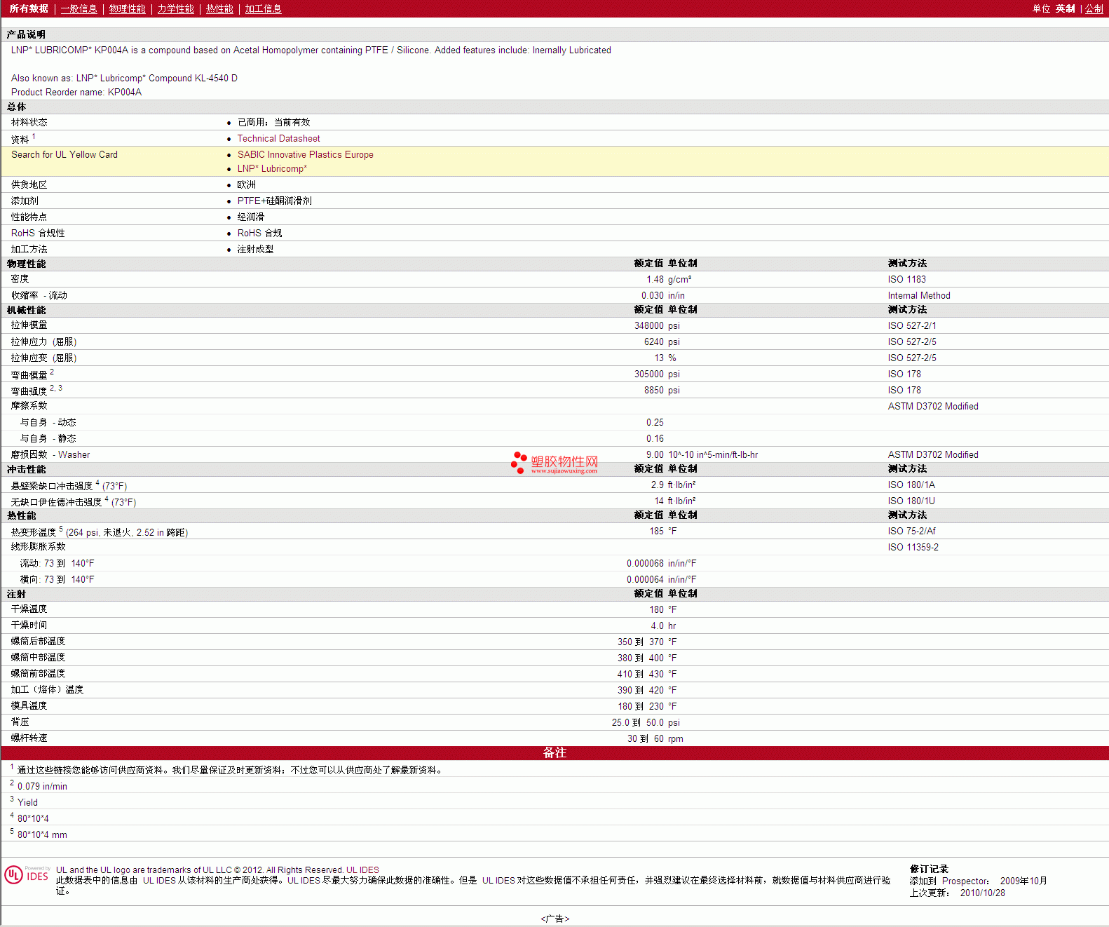 更多LNP Lubricomp PTFE KP004A 物性表报价,图片、材质证明、UL黄卡、物质安全资料表(MSDS)等,最新行情报价等可来电咨询赵先生:13424755533或QQ: 27660005