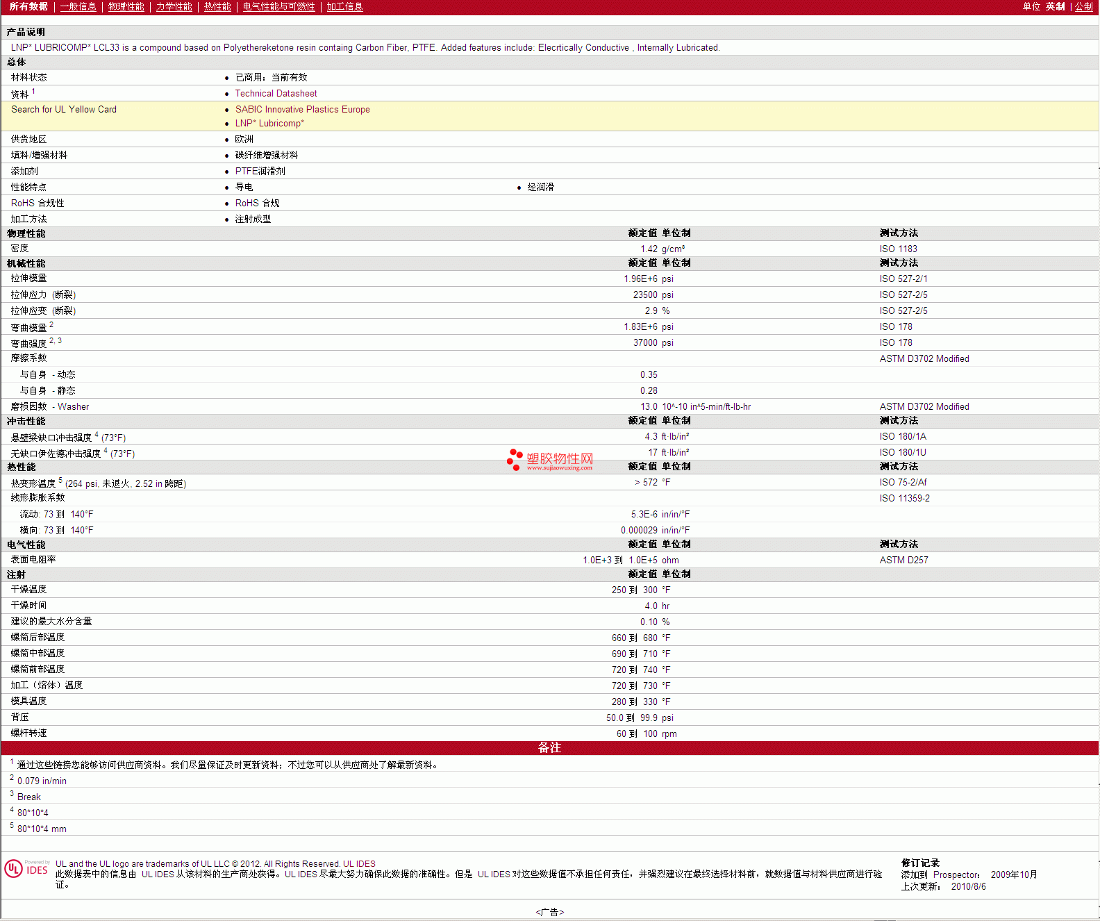 如需了解LNP Lubricomp PTFE LCL33 物性表更多详情,ROHS(SGS)报告、物质安全资料表(MSDS)、材质证明、UL黄卡等,最新行情报价等可来电咨询:赵先生:13424755533或QQ: 27660005