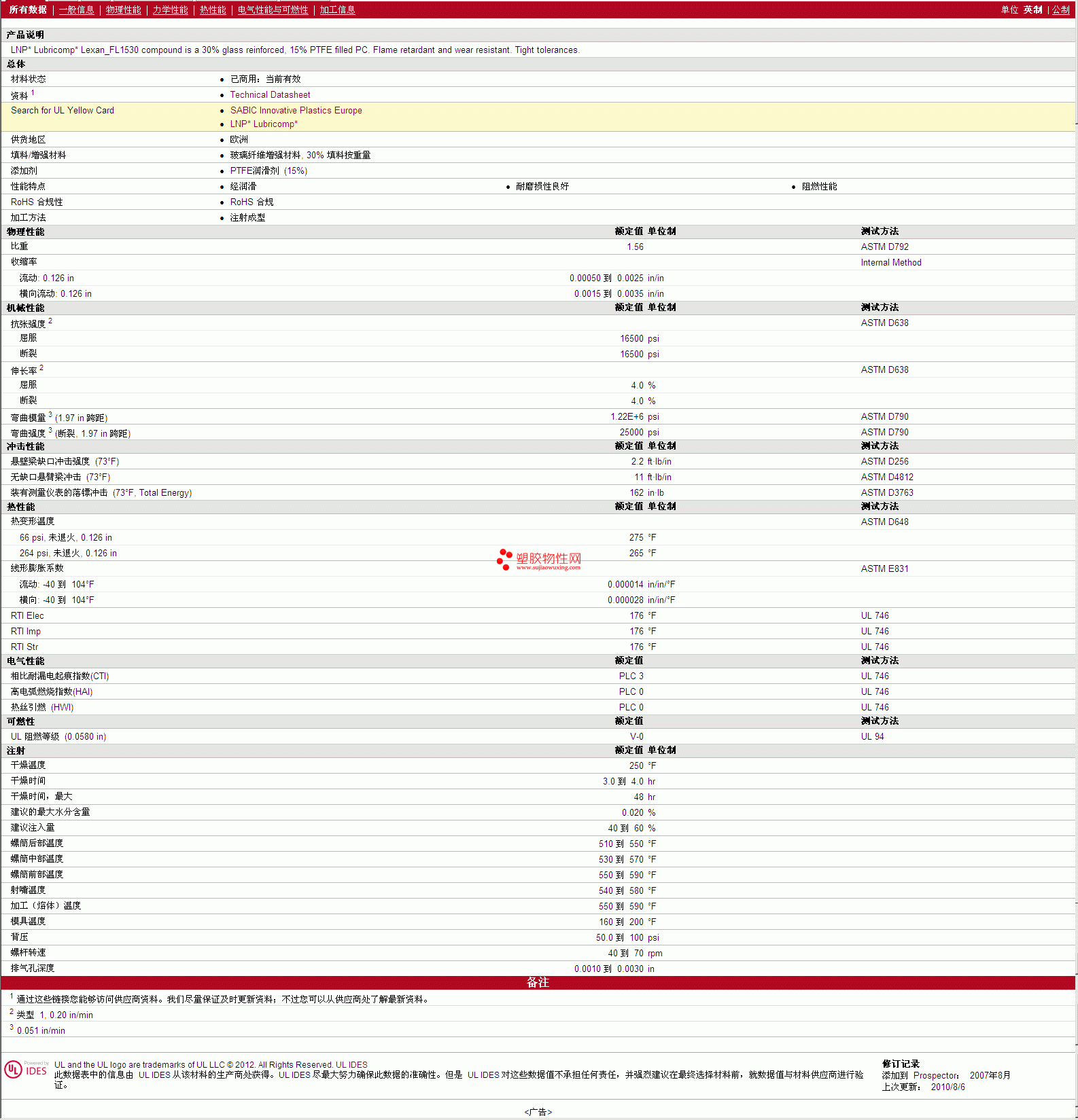如需了解LNP Lubricomp PTFE Lexan_LF1530A 物性表更多详情,ROHS(SGS)报告、物质安全资料表(MSDS)、材质证明、UL黄卡等,最新行情报价等可来电咨询:赵先生:13424755533或QQ: 27660005
