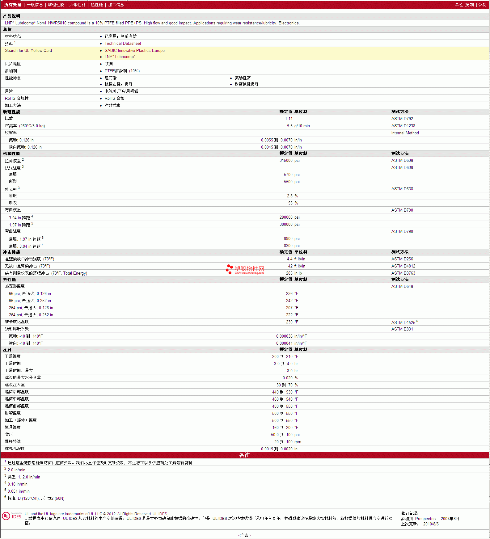 更多LNP Lubricomp PTFE Noryl_NWR5810 物性表报价,图片、材质证明、UL黄卡、物质安全资料表(MSDS)等,最新行情报价等可来电咨询赵先生:13424755533或QQ: 27660005