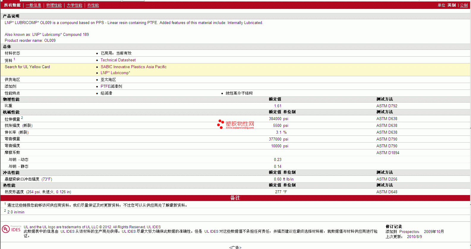 如需了解LNP Lubricomp PTFE OL009 物性表更多详情,ROHS(SGS)报告、物质安全资料表(MSDS)、材质证明、UL黄卡等,最新行情报价等可来电咨询:赵先生:13424755533或QQ: 27660005