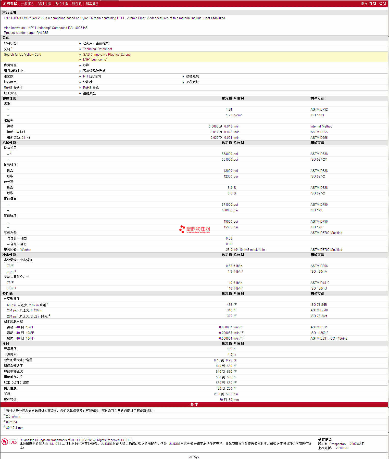 更多LNP Lubricomp PTFE RAL23S 物性表报价,图片、材质证明、UL黄卡、物质安全资料表(MSDS)等,最新行情报价等可来电咨询赵先生:13424755533或QQ: 27660005