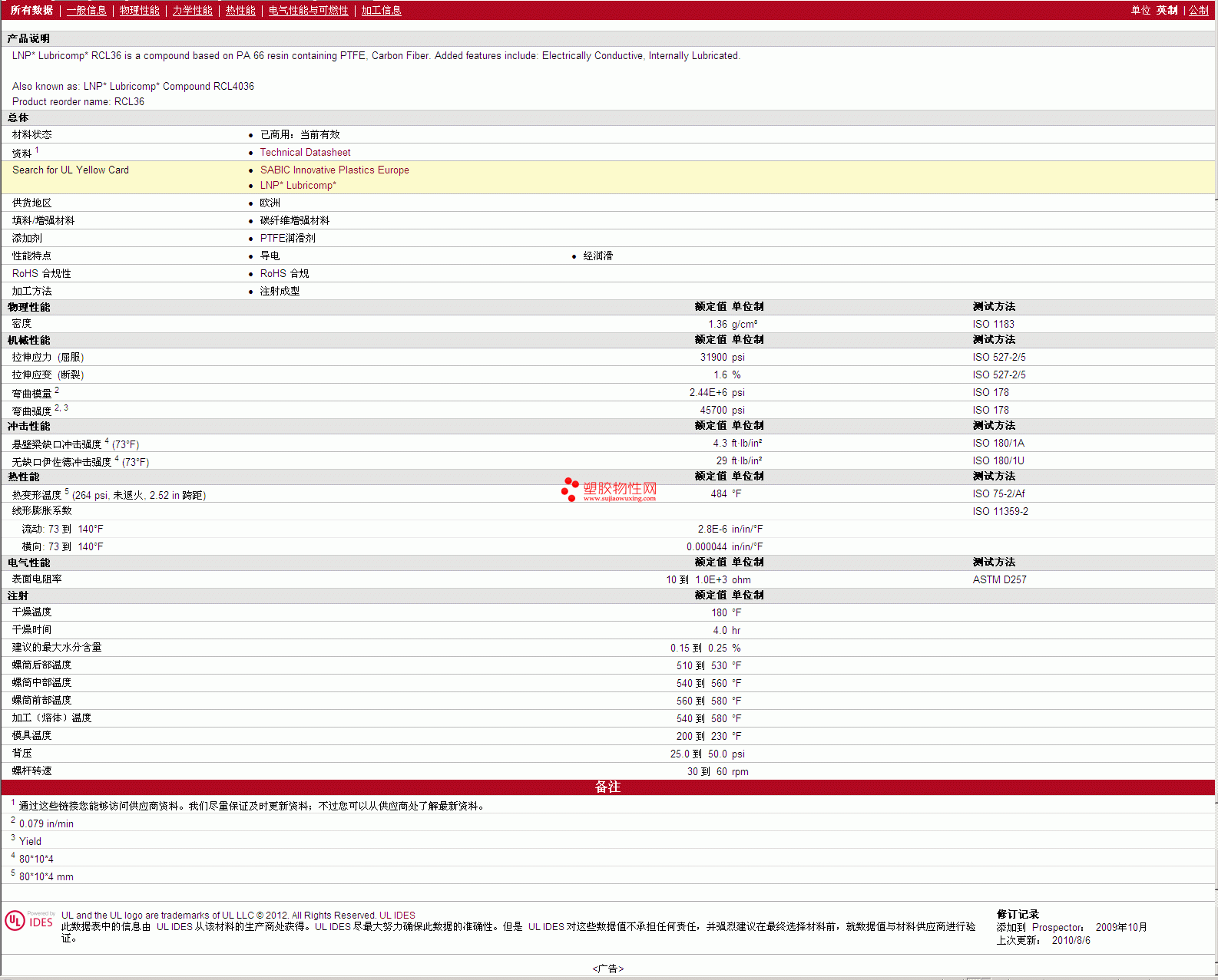 更多 LNP Lubricomp PTFE RCL36 物性表报价,图片、材质证明、UL黄卡、物质安全资料表(MSDS)等可来电咨询赵先生:13424755533或QQ: 27660005