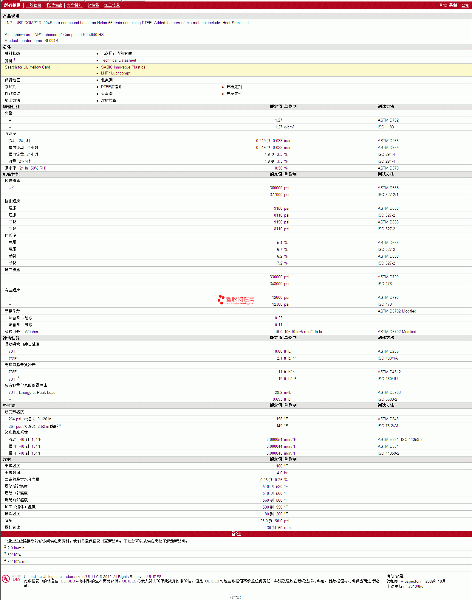 更多LNP Lubricomp PTFE RL004S 物性表报价,图片、材质证明、UL黄卡、物质安全资料表(MSDS)等可来电咨询赵先生:13424755533或QQ: 27660005