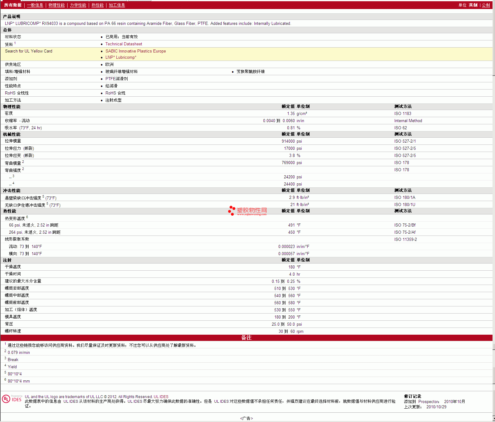 更多LNP Lubricomp PTFE RX94033 物性表报价,图片、材质证明、UL黄卡、物质安全资料表(MSDS)等,最新行情报价等可来电咨询赵先生:13424755533或QQ: 27660005