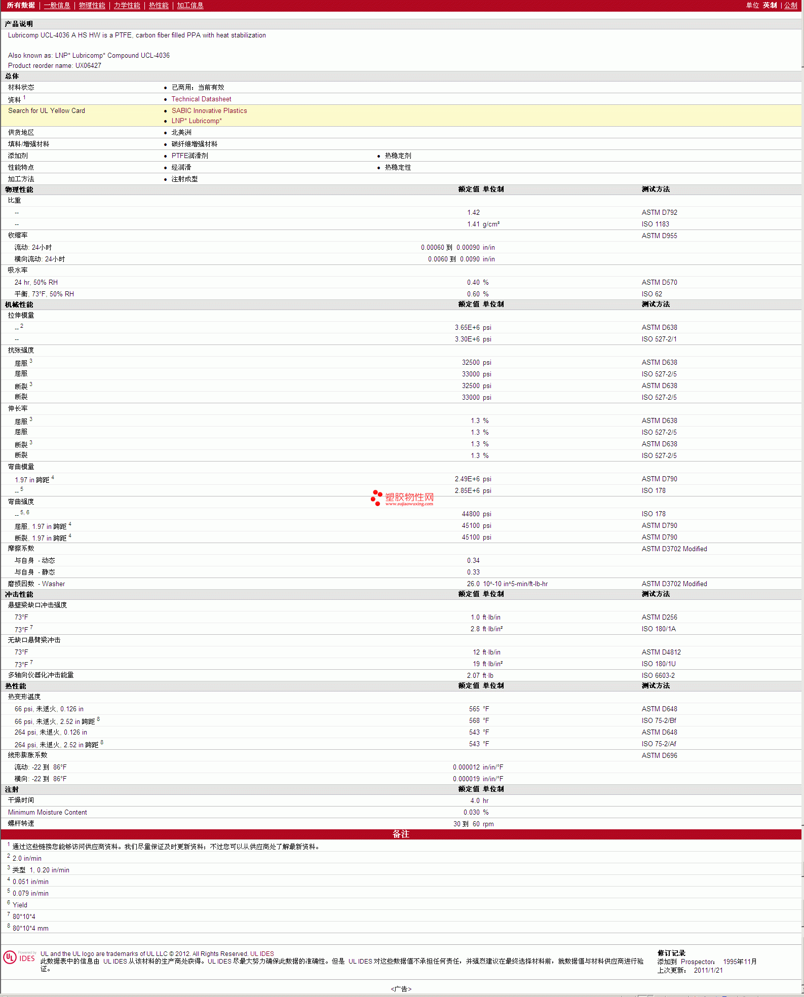 如需了解LNP Lubricomp PTFE UX06427 物性表更多详情,ROHS(SGS)报告、物质安全资料表(MSDS)、材质证明、UL黄卡等,最新行情报价等可来电咨询:赵先生:13424755533或QQ: 27660005
