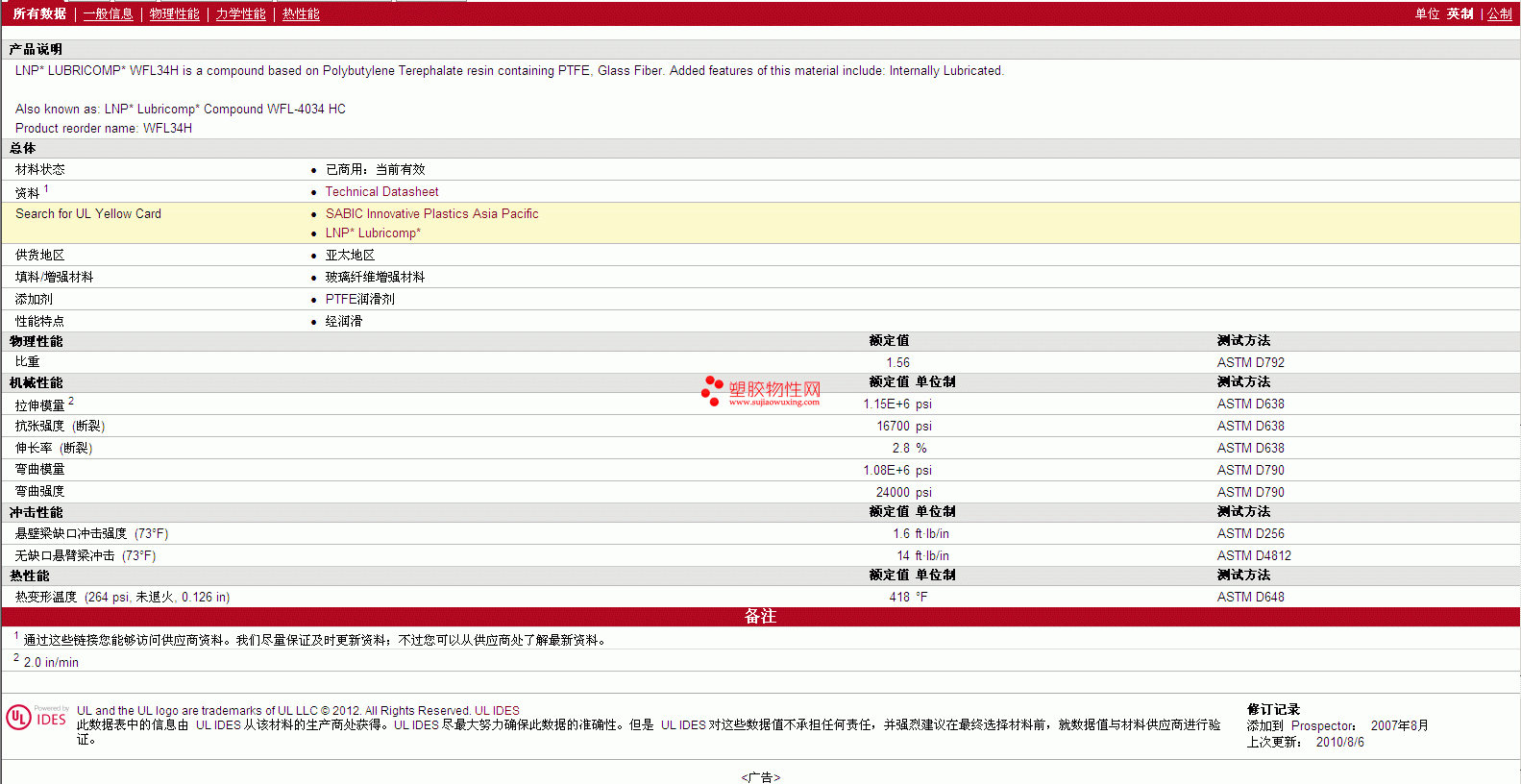 更多LNP Lubricomp PTFE WFL34H 物性表报价,图片、材质证明、UL黄卡、物质安全资料表(MSDS)等,最新行情报价等可来电咨询赵先生:13424755533或QQ: 27660005