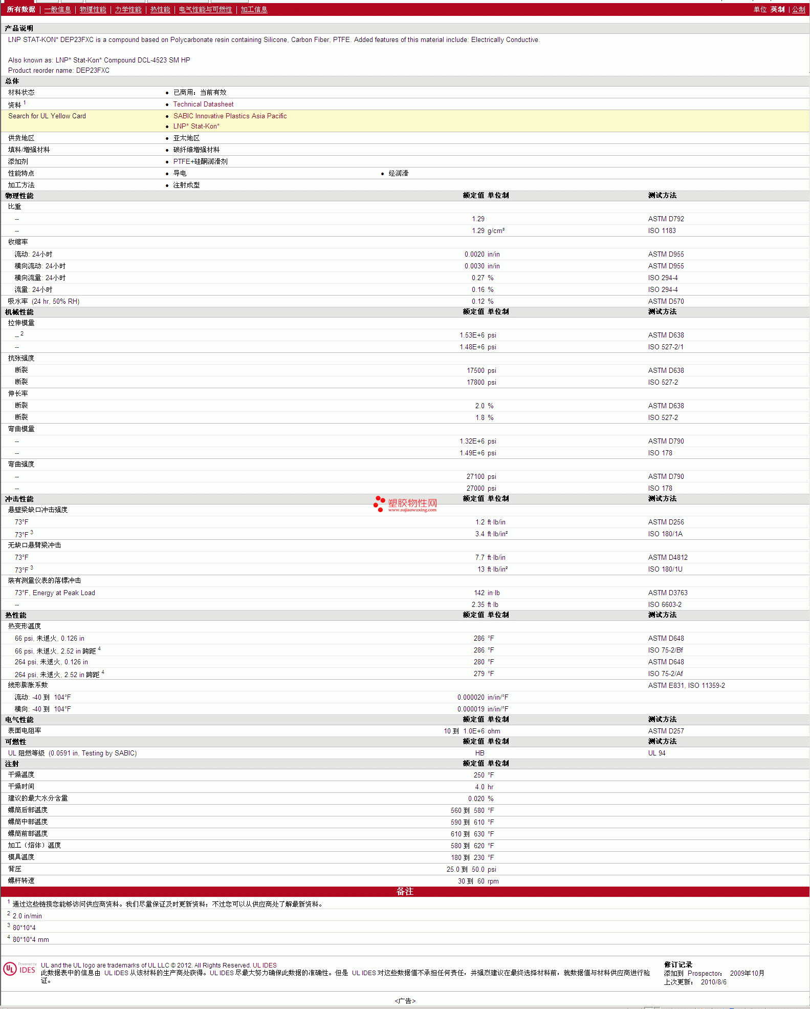 如需了解 LNP Stat-Kon PTFE DEP23FXC 物性表更多详情,ROHS(SGS)报告、物质安全资料表(MSDS)、材质证明、UL黄卡等,最新行情报价等可来电咨询:赵先生:13424755533或QQ: 27660005