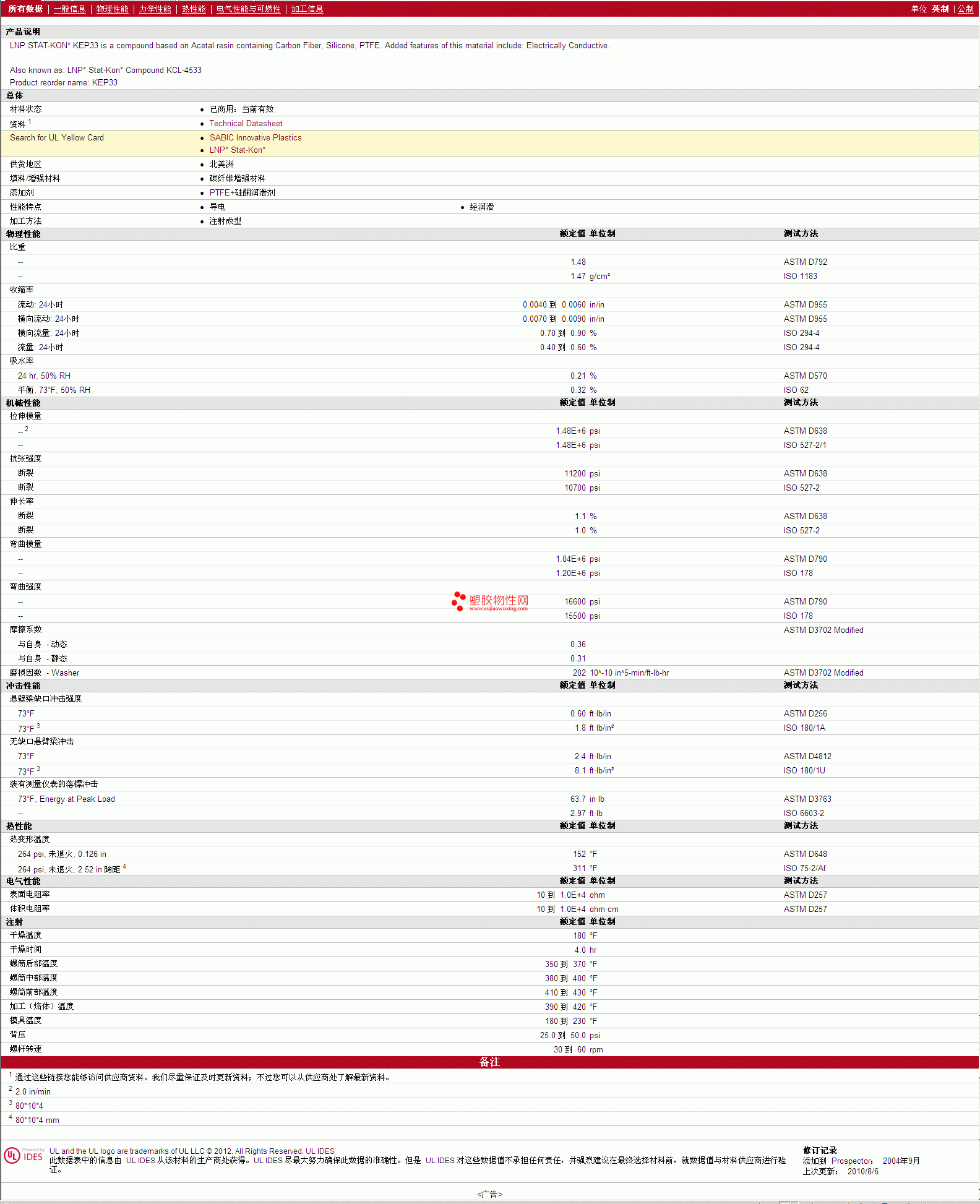 更多LNP Stat-Kon PTFE KEP33 物性表报价,图片、材质证明、UL黄卡、物质安全资料表(MSDS)等,最新行情报价等可来电咨询赵先生:13424755533或QQ: 27660005