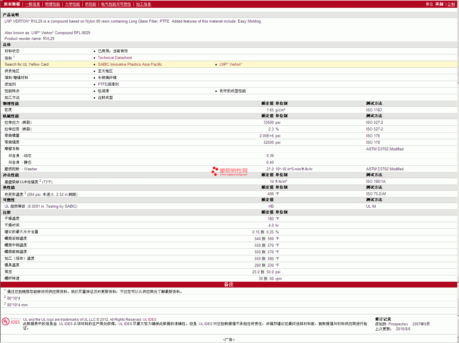 更多LNP Verton PTFE RVL29 物性表报价,图片、材质证明、UL黄卡、物质安全资料表(MSDS)等,最新行情报价等可来电咨询赵先生:13424755533或QQ: 27660005
