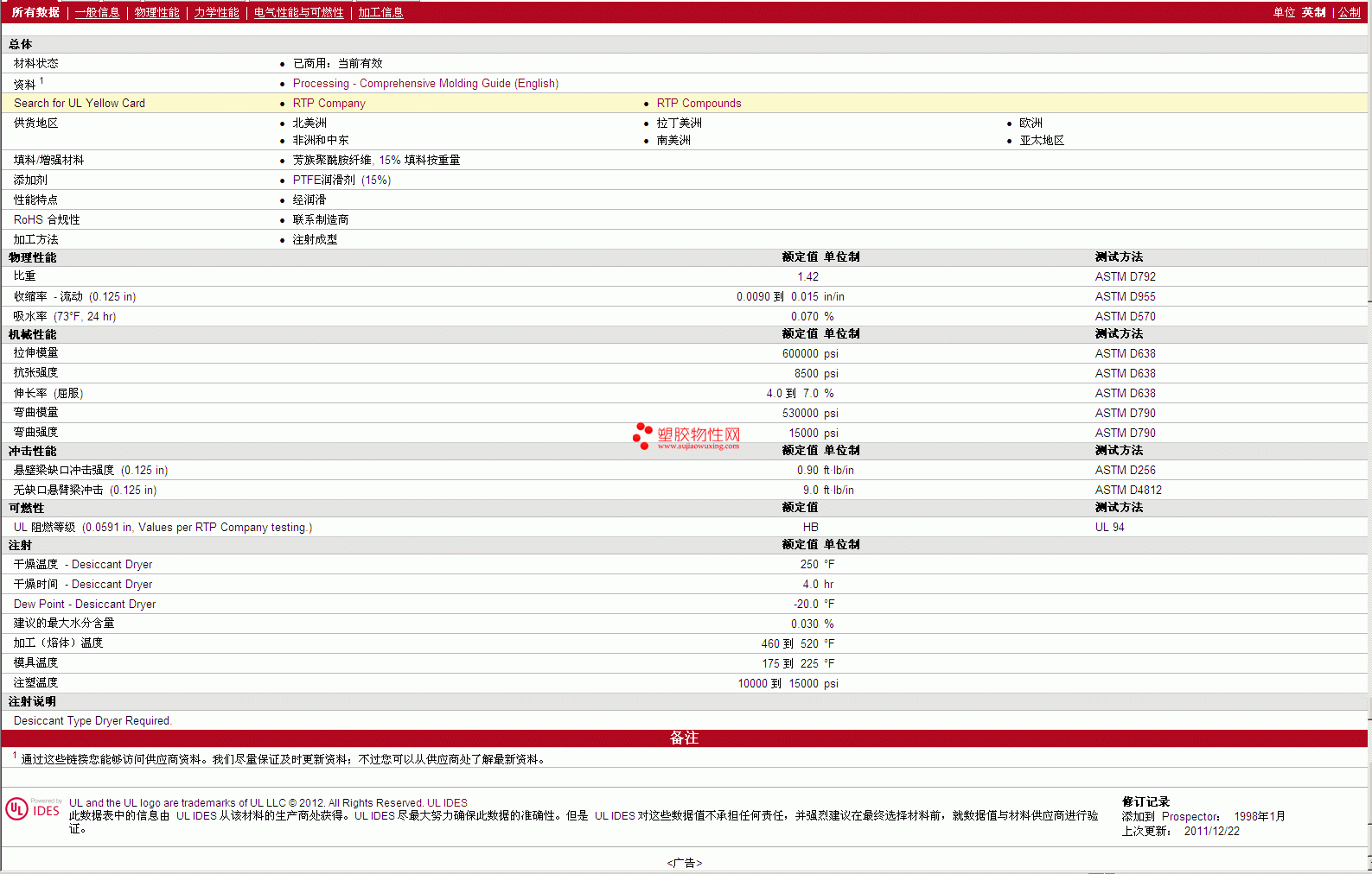 更多RTP Compounds PTFE 1000 AR 15 TFE 15 物性表报价,图片、材质证明、UL黄卡、物质安全资料表(MSDS)等可来电咨询赵先生:13424755533或QQ: 27660005