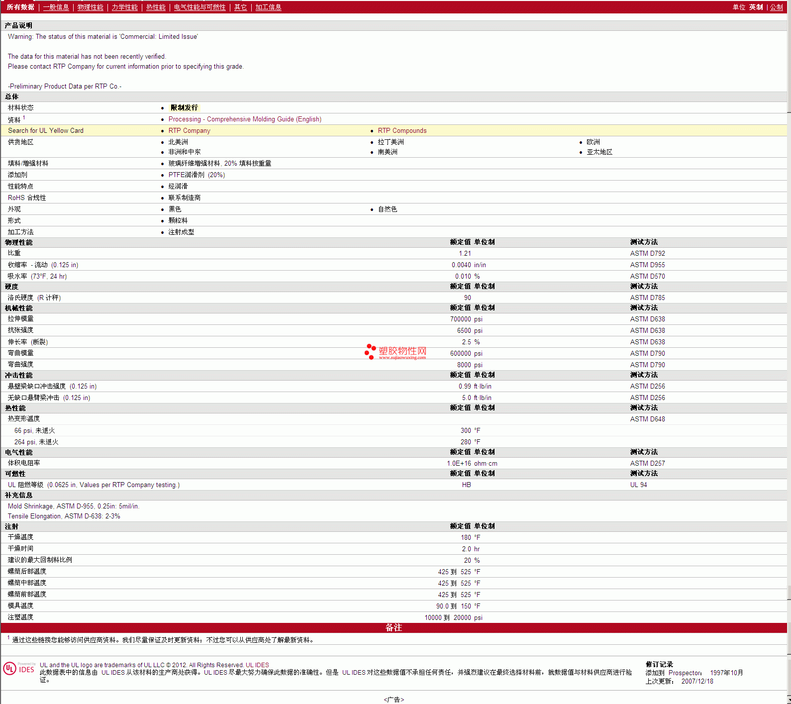 需了解RTP Compounds PTFE 103 TFE 20 物性表材质证明、ROHS(SGS)报告、物质安全资料表(MSDS)、UL黄卡等可来电咨询:赵先生:13424755533或QQ: 27660005