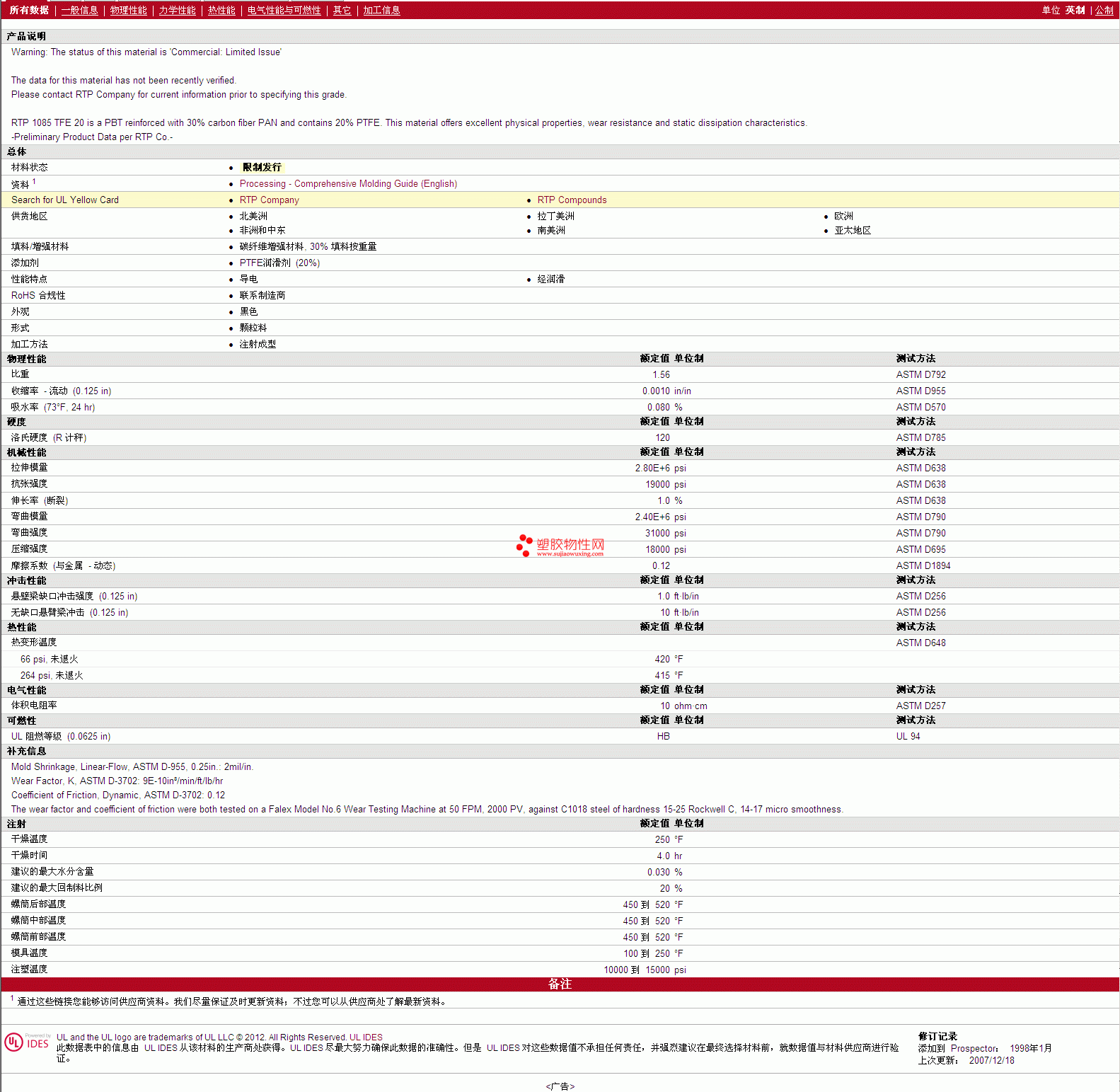 需了解RTP Compounds PTFE 1085 TFE 20 物性表材质证明、ROHS(SGS)报告、物质安全资料表(MSDS)、UL黄卡等可来电咨询:赵先生:13424755533或QQ: 27660005