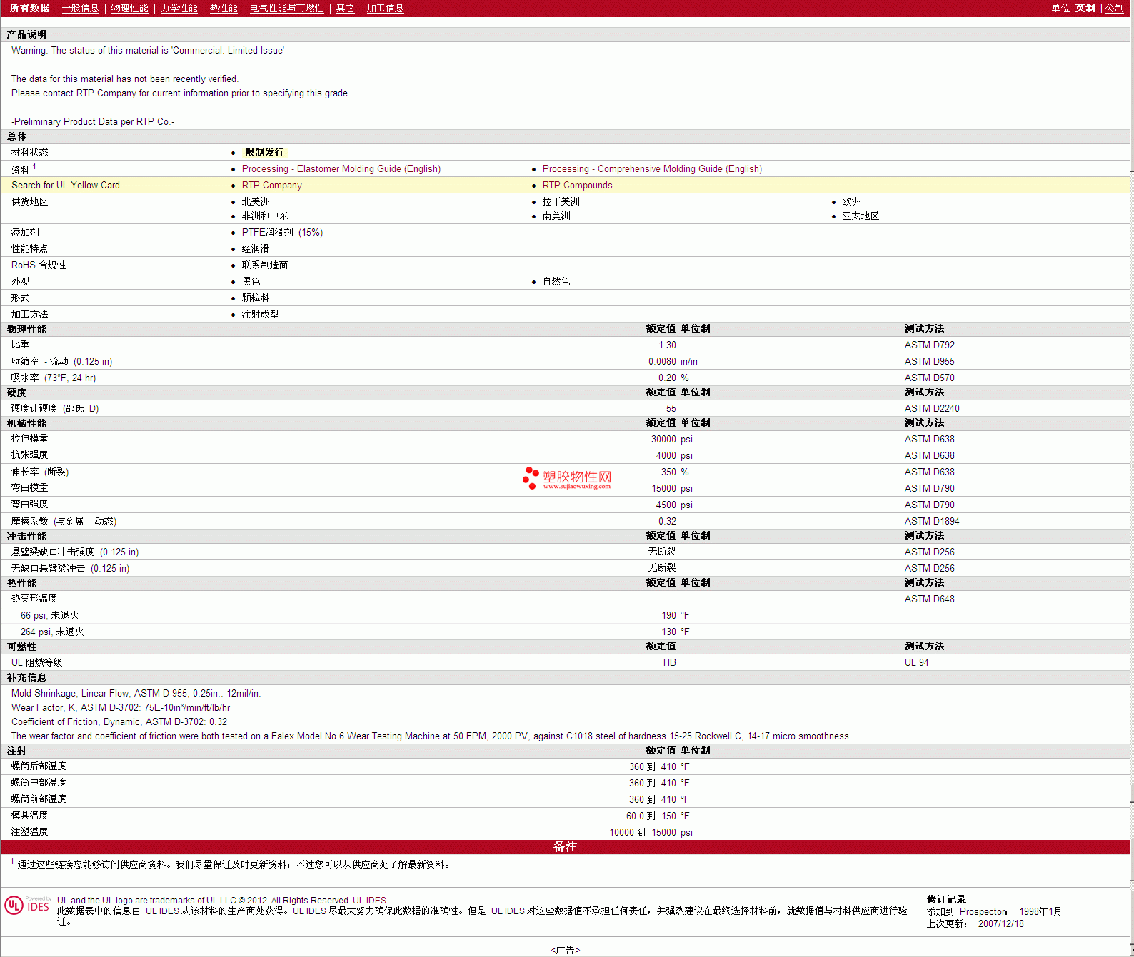 需了解 RTP Compounds PTFE 1200-55D TFE 15 物性表材质证明、ROHS(SGS)报告、物质安全资料表(MSDS)、UL黄卡等可来电咨询:赵先生:13424755533或QQ: 27660005
