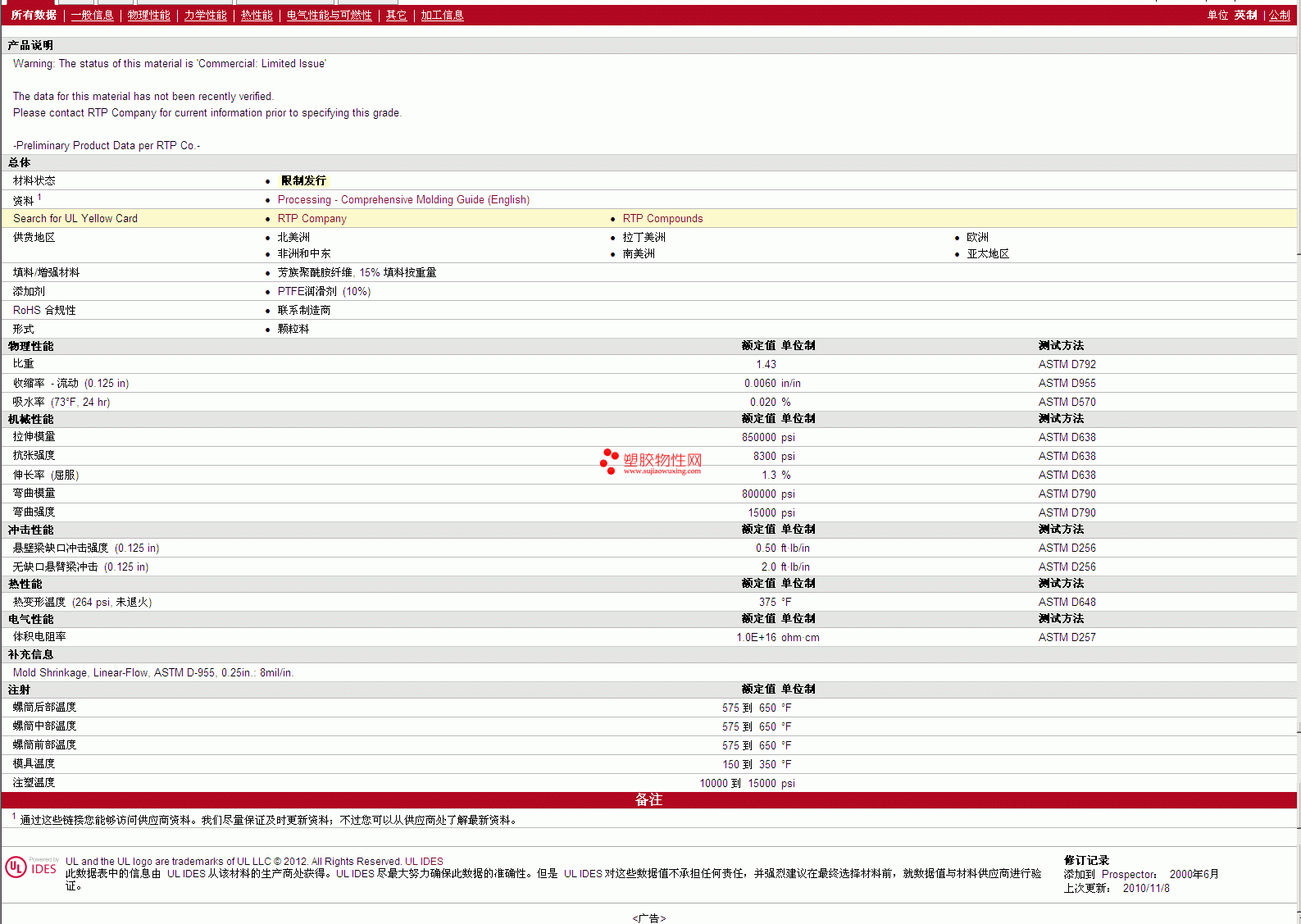 更多RTP Compounds PTFE 1300 AR 15 TFE 10 物性表报价,图片、材质证明、UL黄卡、物质安全资料表(MSDS)等可来电咨询赵先生:13424755533或QQ: 27660005