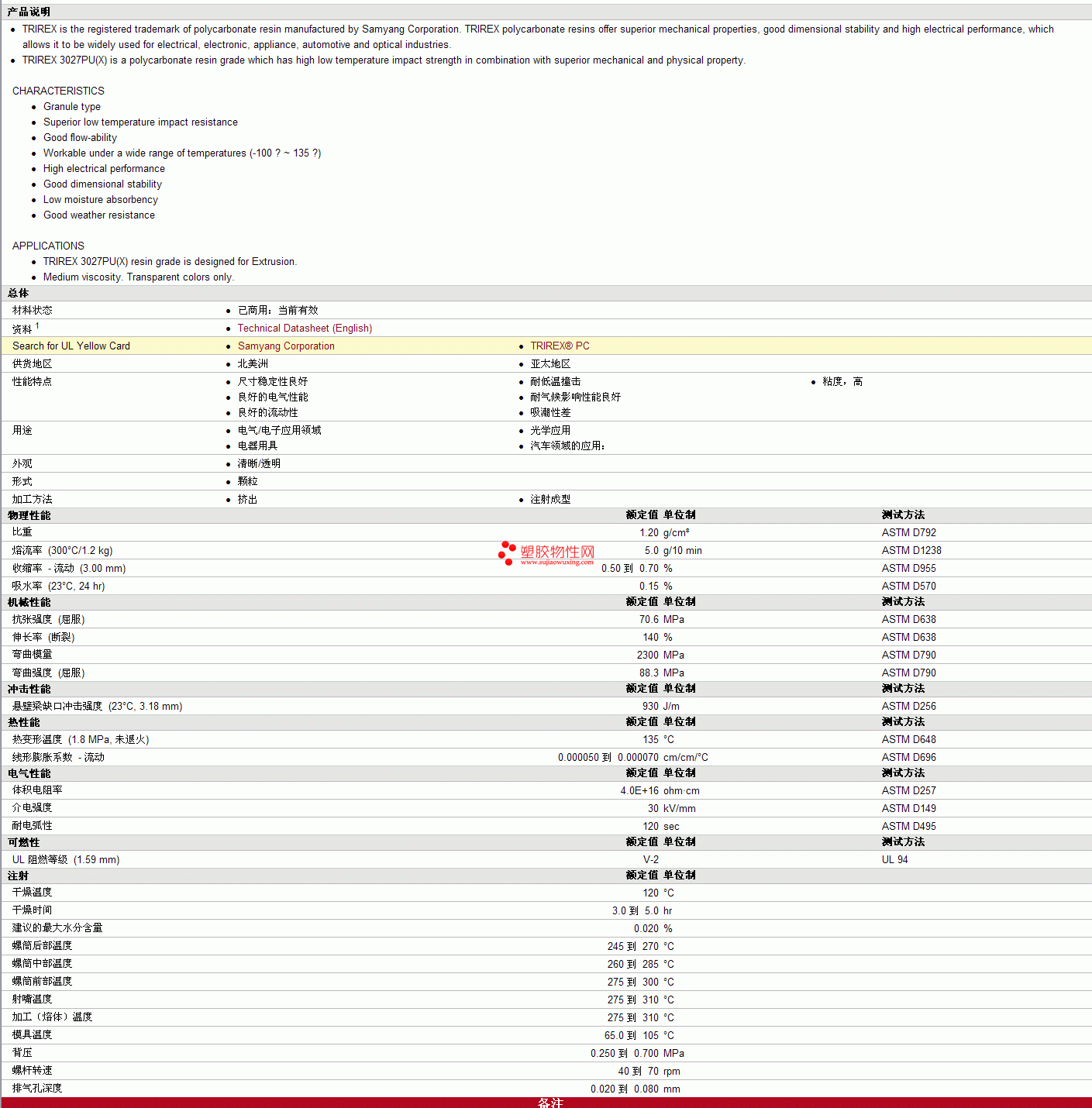 TRIREX PC 3027PU(X)物性表 更多资料见下图