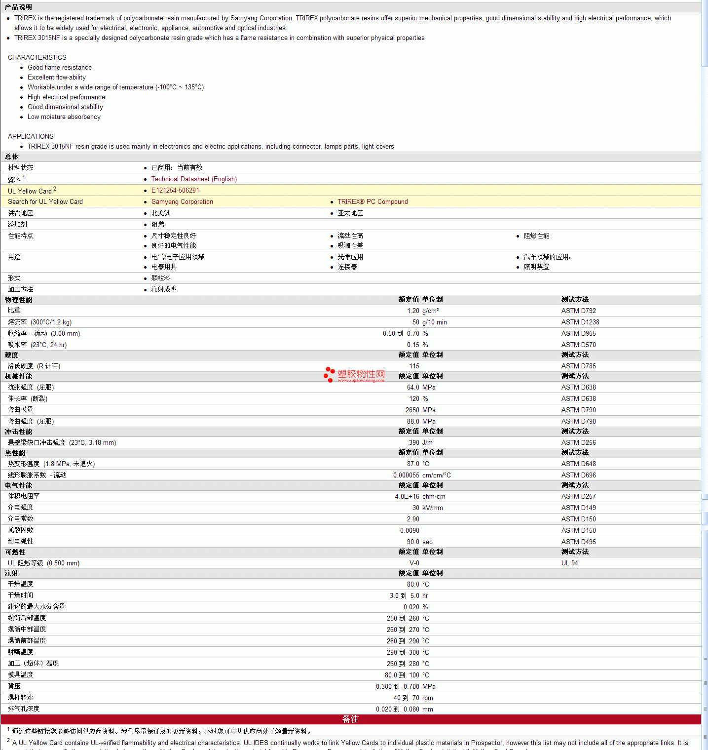 TRIREX PC Compound 3015NF物性表更多资料见下图