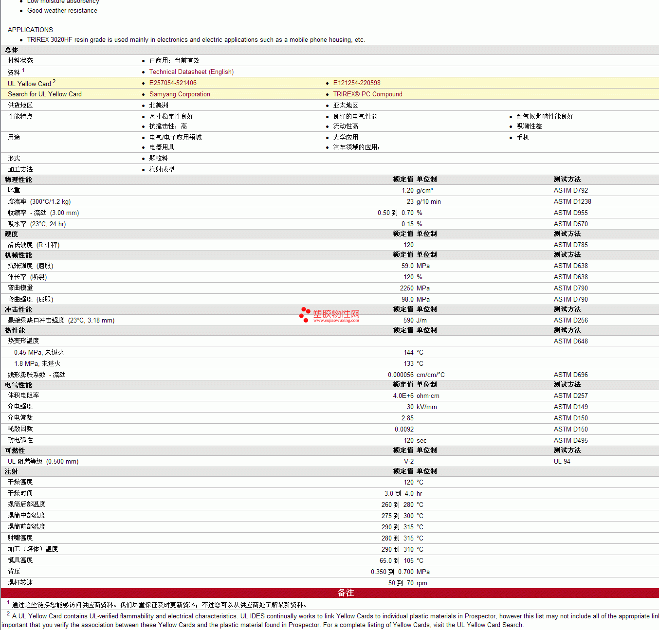 TRIREX PC Compound 3020HF物性表 更多资料见下图