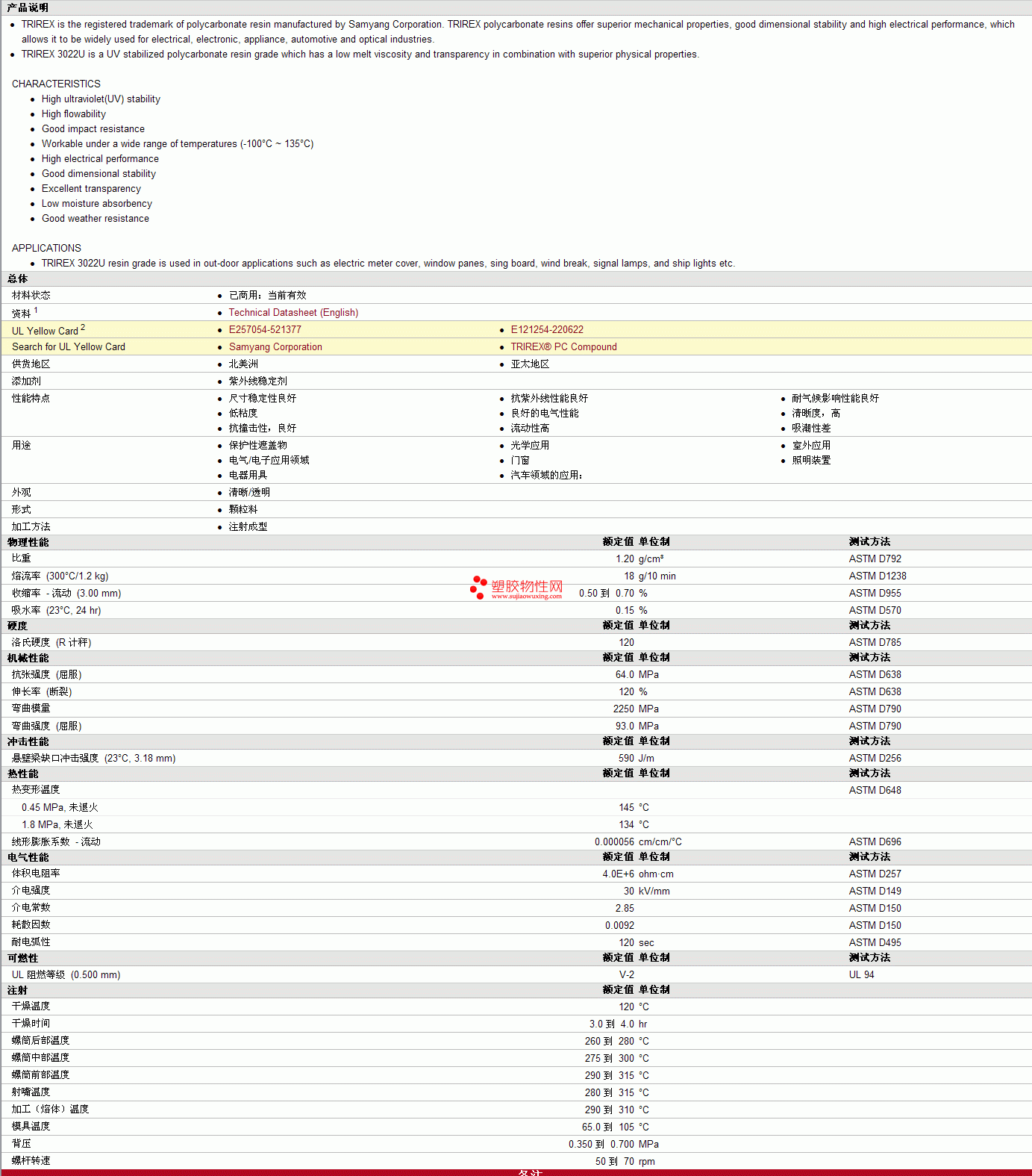 TRIREX PC Compound 3022U物性表 更多资料见下图
