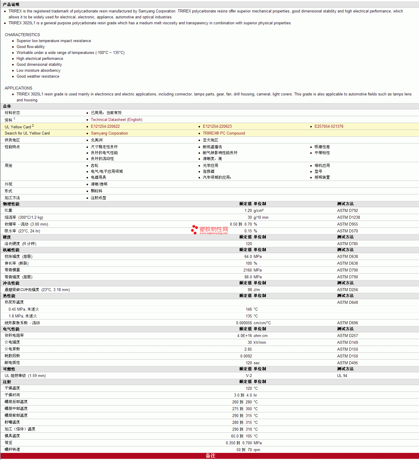 TRIREX PC Compound 3025L1物性表 更多资料见下图