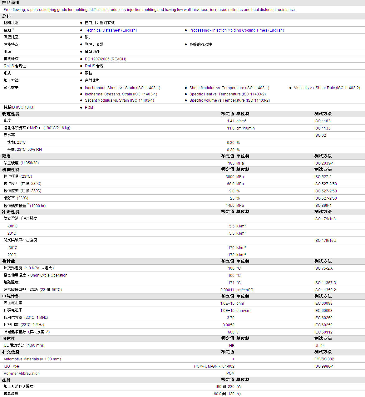 | 溶化体积流率(MVR) (190°C/2.16 kg) | 11.0 | cm³/10min | ISO 1133 |
