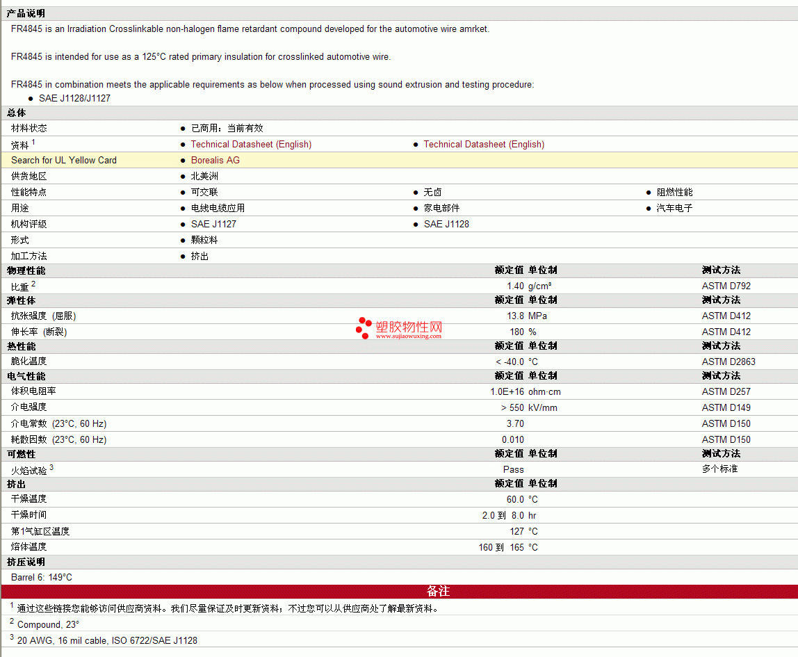 Borealis xlpe FR4845物性表 见图片
