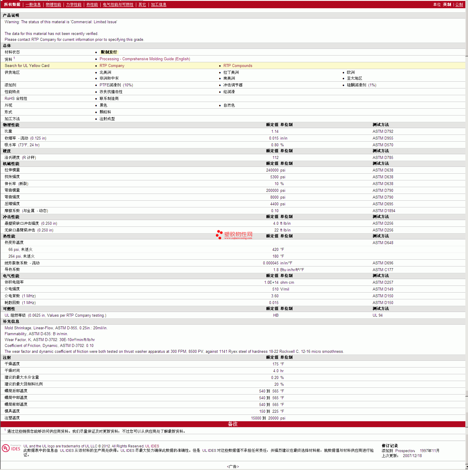 更多 RTP Compounds PTFE 200H TFE 10 SI 1 物性表图片,报价、物质安全资料表(MSDS)、材质证明、UL黄卡等,最新行情报价等可来电咨询赵先生:13424755533或QQ: 27660005