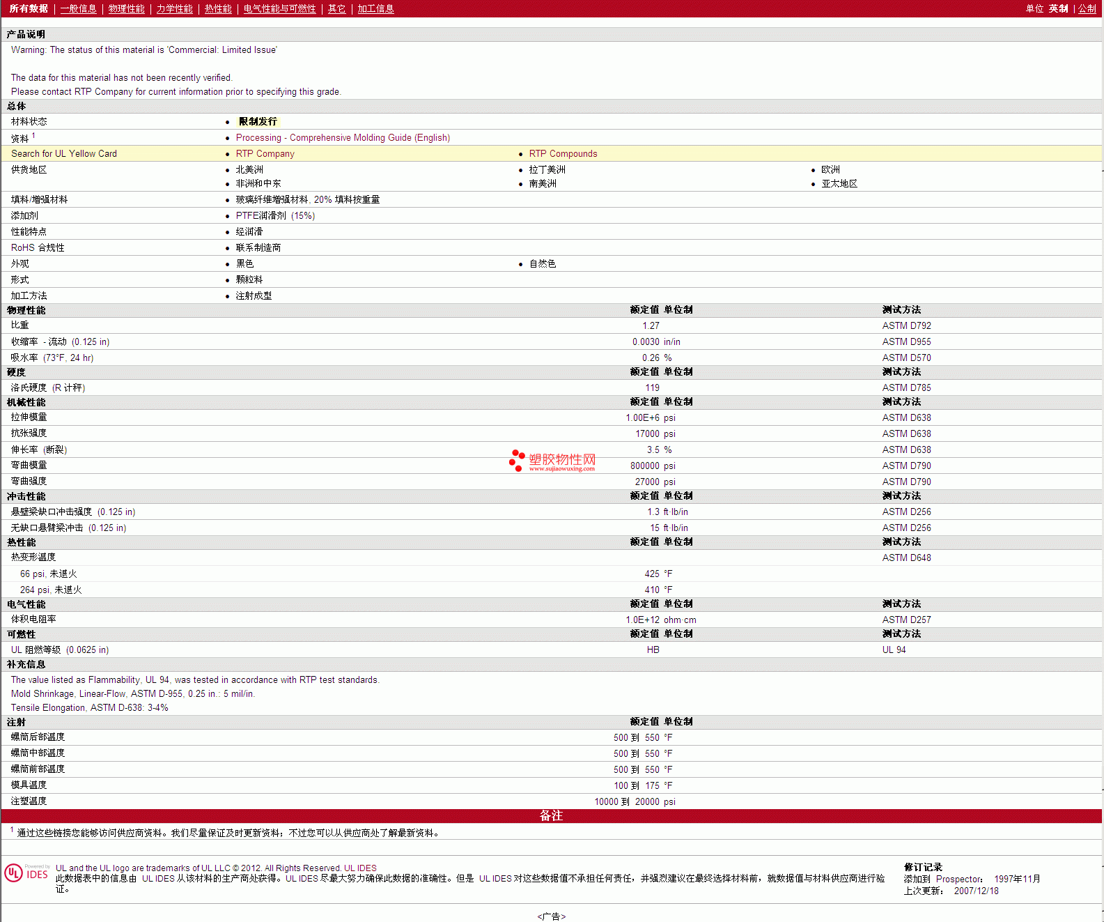 RTP Compounds PTFE 203B TFE 15 物性表