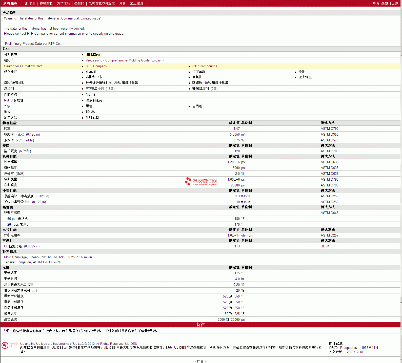 如需了解RTP Compounds PTFE 203D GB 10 TFE 13 SI 2 物性表更多详情,ROHS(SGS)报告、物质安全资料表(MSDS)、材质证明、UL黄卡等,最新行情报价等可来电咨询:赵先生:13424755533或QQ: 27660005