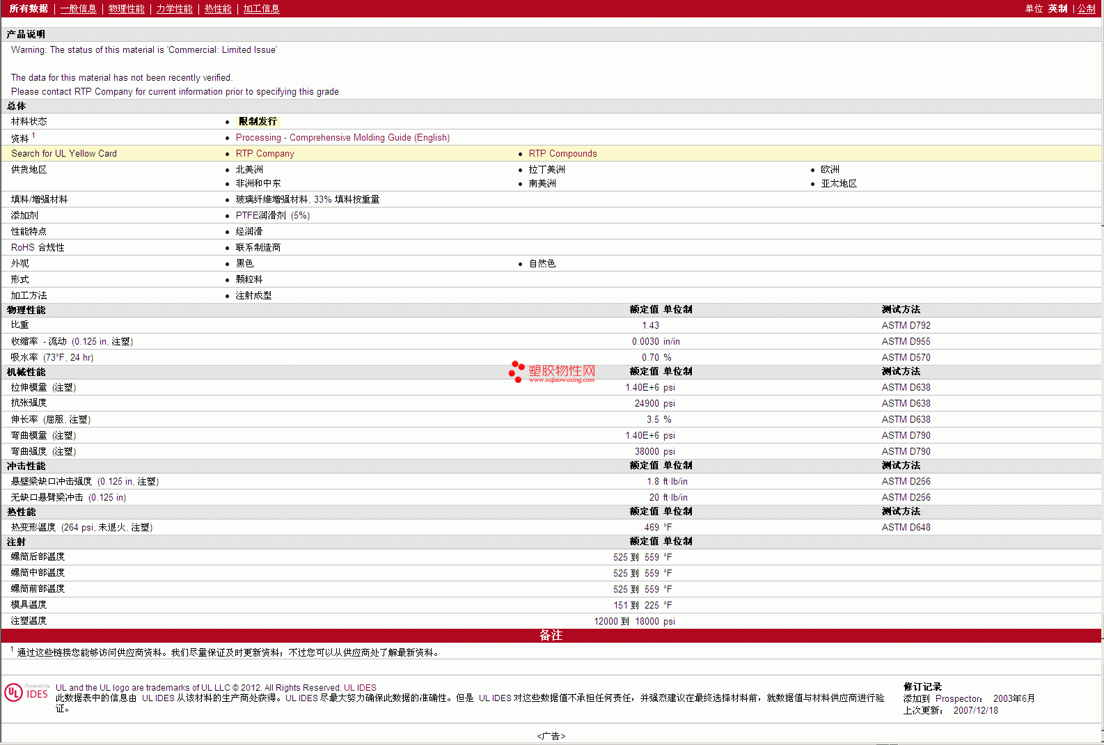 如需了解 RTP Compounds PTFE 205.3 TFE 5 物性表更多详情,ROHS(SGS)报告、物质安全资料表(MSDS)、材质证明、UL黄卡等,最新行情报价等可来电咨询:赵先生:13424755533或QQ: 27660005