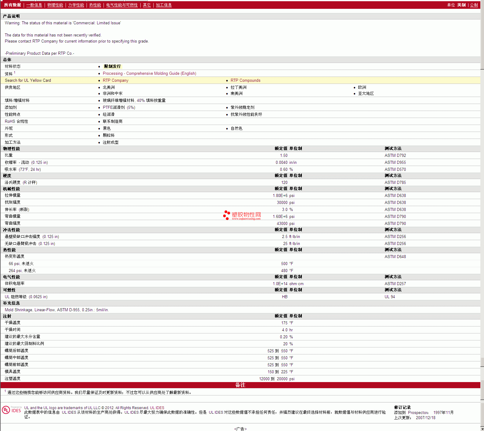 更多RTP Compounds PTFE 207 TFE 5 UV 物性表报价,图片、材质证明、UL黄卡、物质安全资料表(MSDS)等可来电咨询赵先生:13424755533或QQ: 27660005