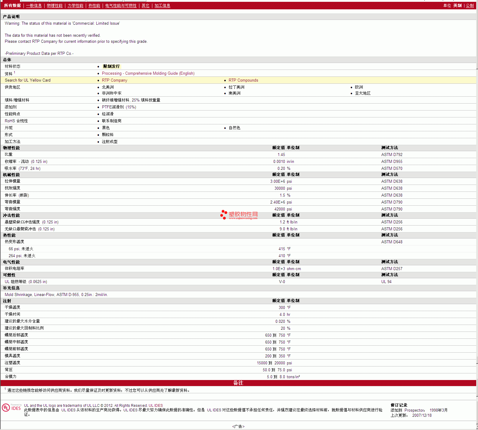 RTP Compounds PEEK 2207 HF 物性表
