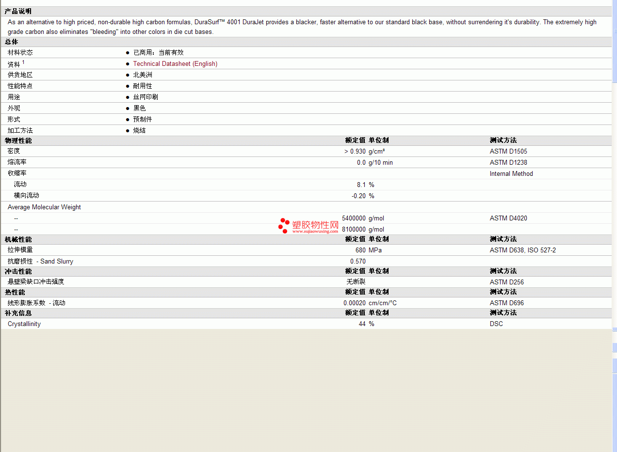 DuraSurf uhmwpe4001 DuraJet物性表 见图片