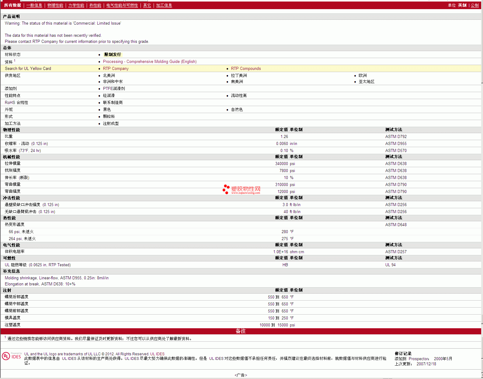 更多RTP Compounds PTFE 300 HF TFE 10 物性表图片,报价、物质安全资料表(MSDS)、材质证明、UL黄卡等,最新行情报价等可来电咨询赵先生:13424755533或QQ: 27660005