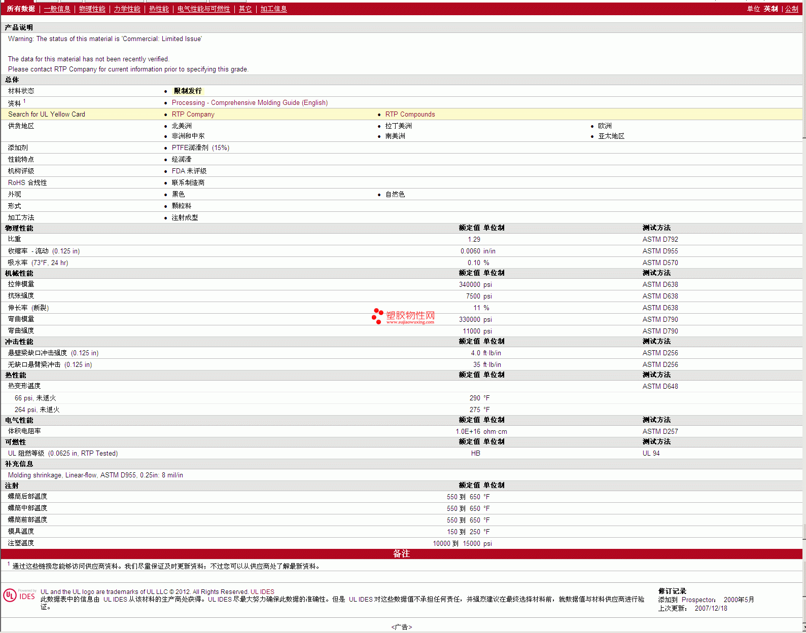 需了解RTP Compounds PTFE 300 TFE 15 Z 物性表材质证明、ROHS(SGS)报告、物质安全资料表(MSDS)、UL黄卡等可来电咨询:赵先生:13424755533或QQ: 27660005