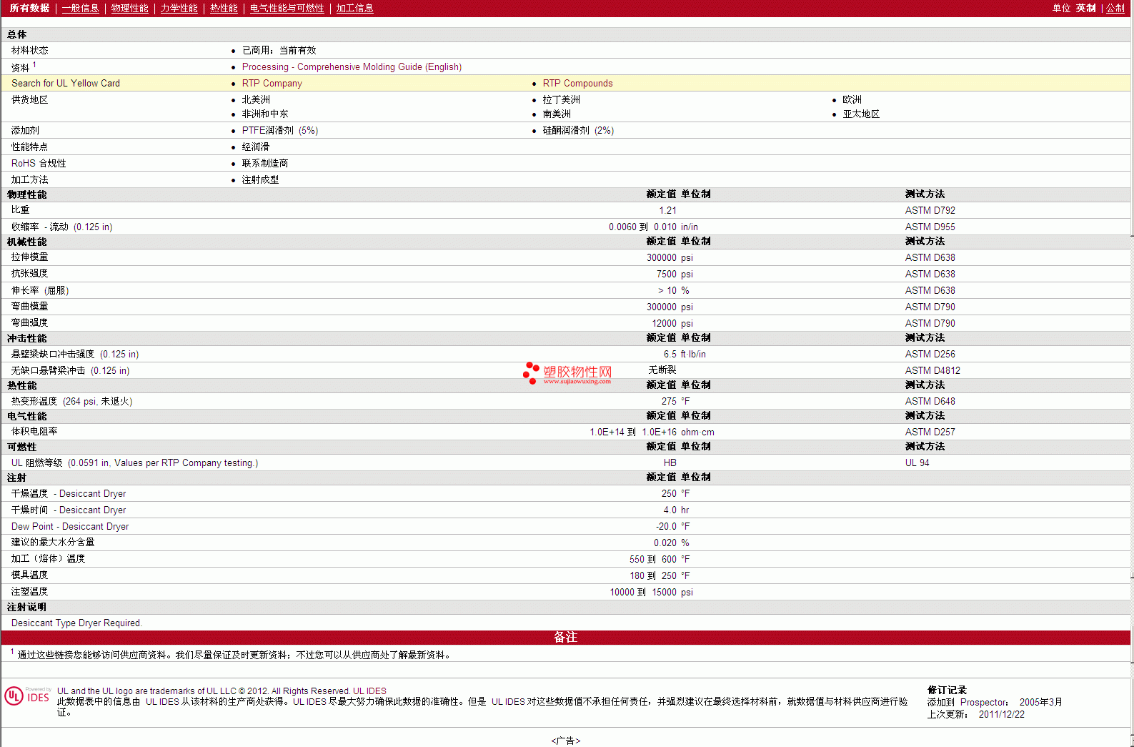 需了解RTP Compounds PTFE 300 TFE 5 SI 2 物性表更多详情,材质证明、ROHS(SGS)报告、物质安全资料表(MSDS)、UL黄卡等,最新行情报价等可来电咨询:赵先生:13424755533或QQ: 27660005