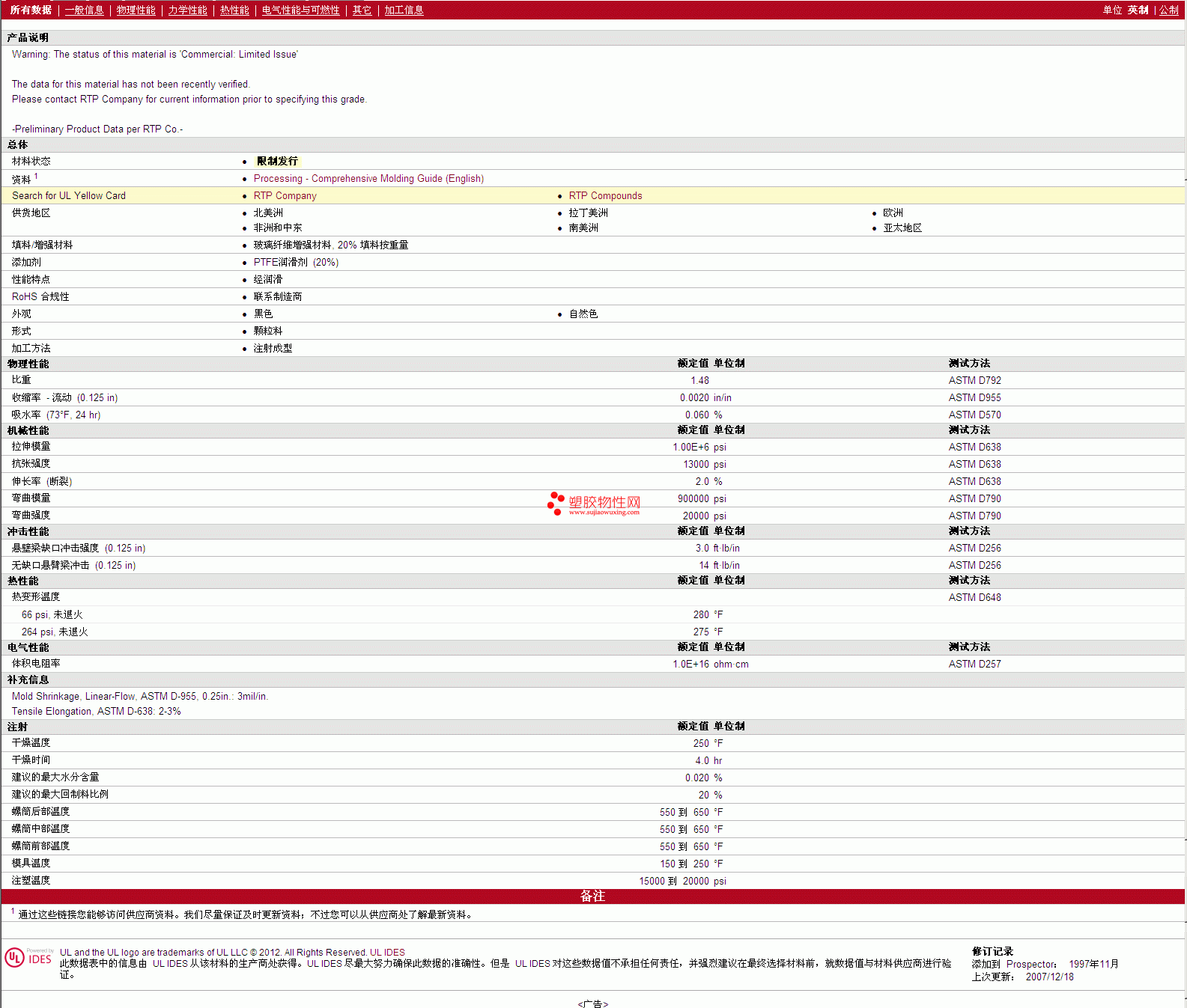 更多RTP Compounds PTFE 303 S TFE 20 物性表报价,图片、材质证明、UL黄卡、物质安全资料表(MSDS)等可来电咨询赵先生:13424755533或QQ: 27660005