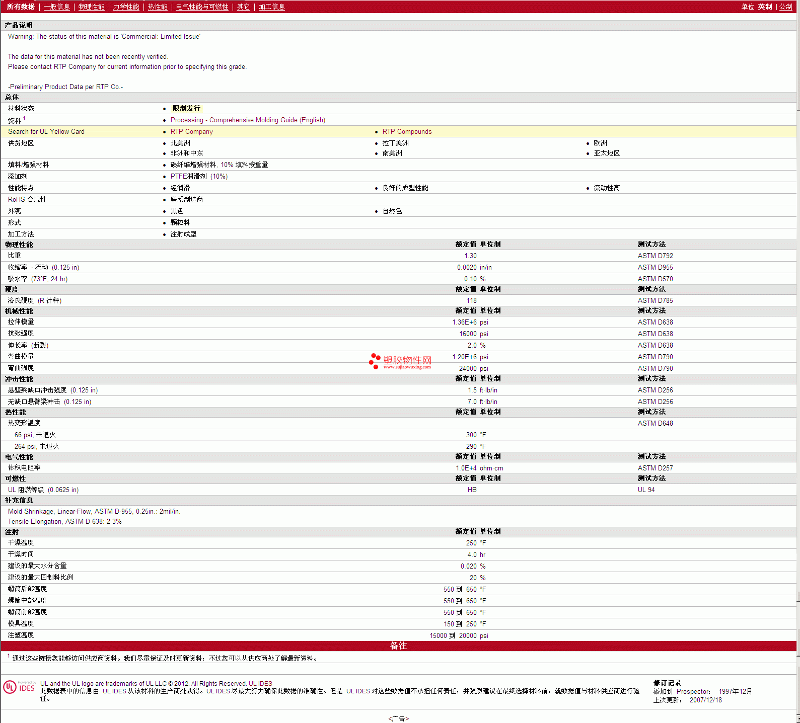更多RTP Compounds PTFE 381 TFE 10 EM HF 物性表报价,图片、材质证明、UL黄卡、物质安全资料表(MSDS)等可来电咨询赵先生:13424755533或QQ: 27660005