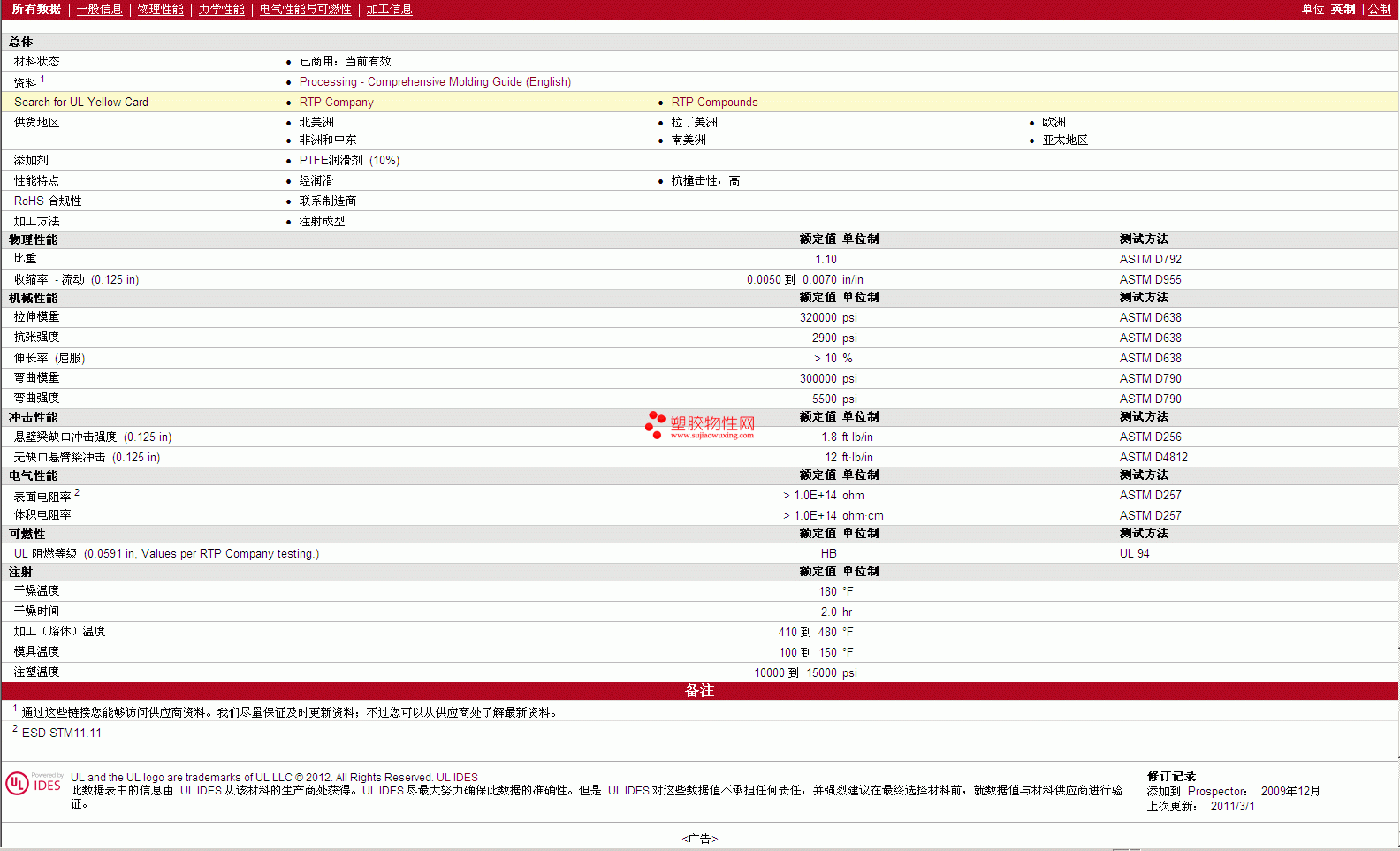如需了解RTP Compounds PTFE 400 HI TFE 10 物性表更多详情,ROHS(SGS)报告、物质安全资料表(MSDS)、材质证明、UL黄卡等,最新行情报价等可来电咨询:赵先生:13424755533或QQ: 27660005
