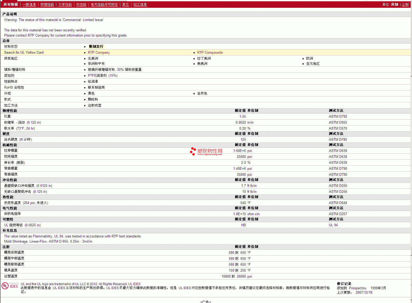 如需了解 RTP Compounds PTFE 4005 A TFE 15 物性表更多详情,ROHS(SGS)报告、物质安全资料表(MSDS)、材质证明、UL黄卡等,最新行情报价等可来电咨询:赵先生:13424755533或QQ: 27660005