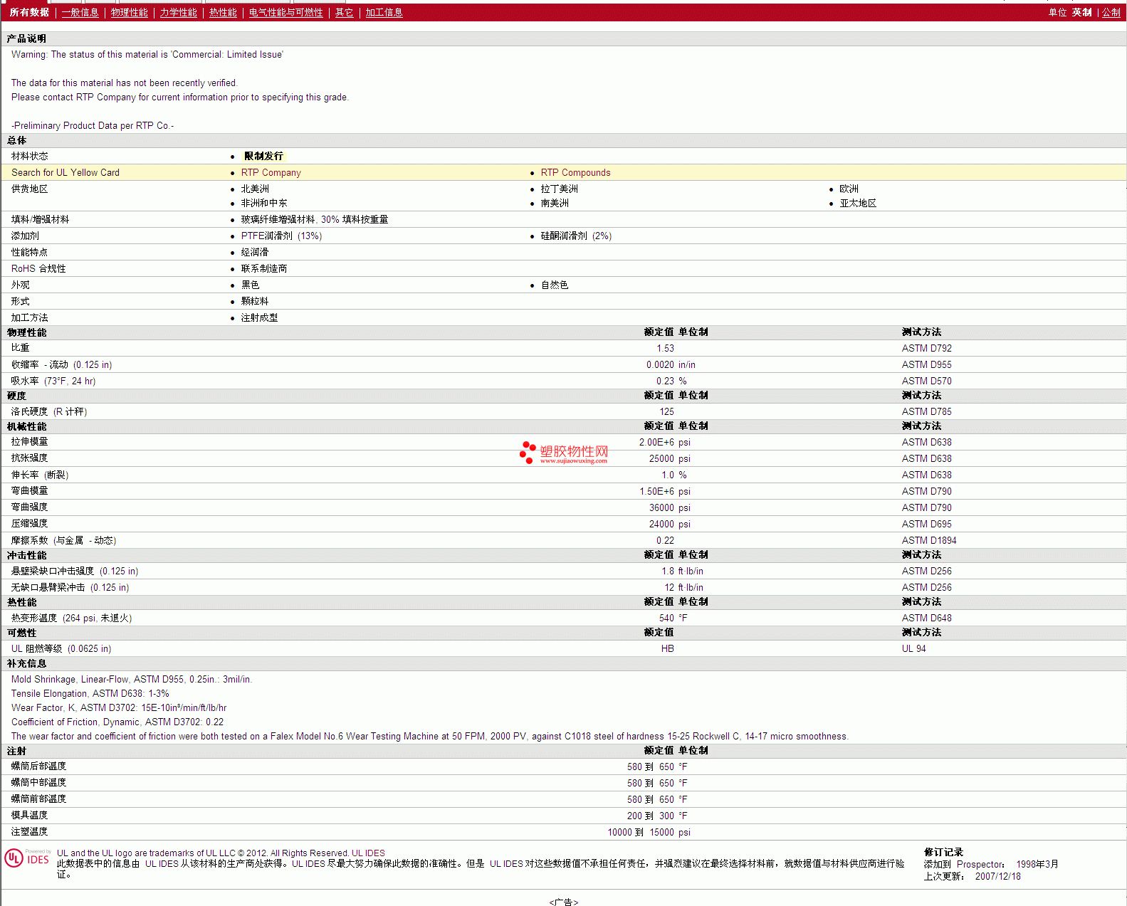 RTP Compounds PTFE 4005 TFE 13 SI 2 物性表RTP Compounds 4005 TFE 13 SI 2