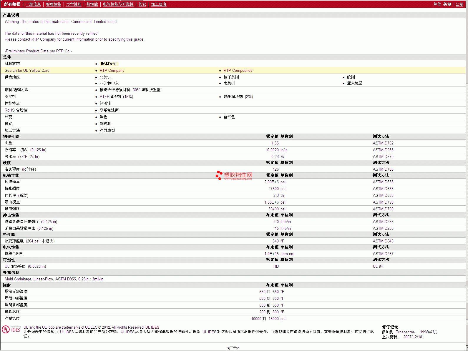 更多RTP Compounds PTFE 4005 TFE 15 SI 2 物性表图片,报价、物质安全资料表(MSDS)、材质证明、UL黄卡等,最新行情报价等可来电咨询赵先生:13424755533或QQ: 27660005