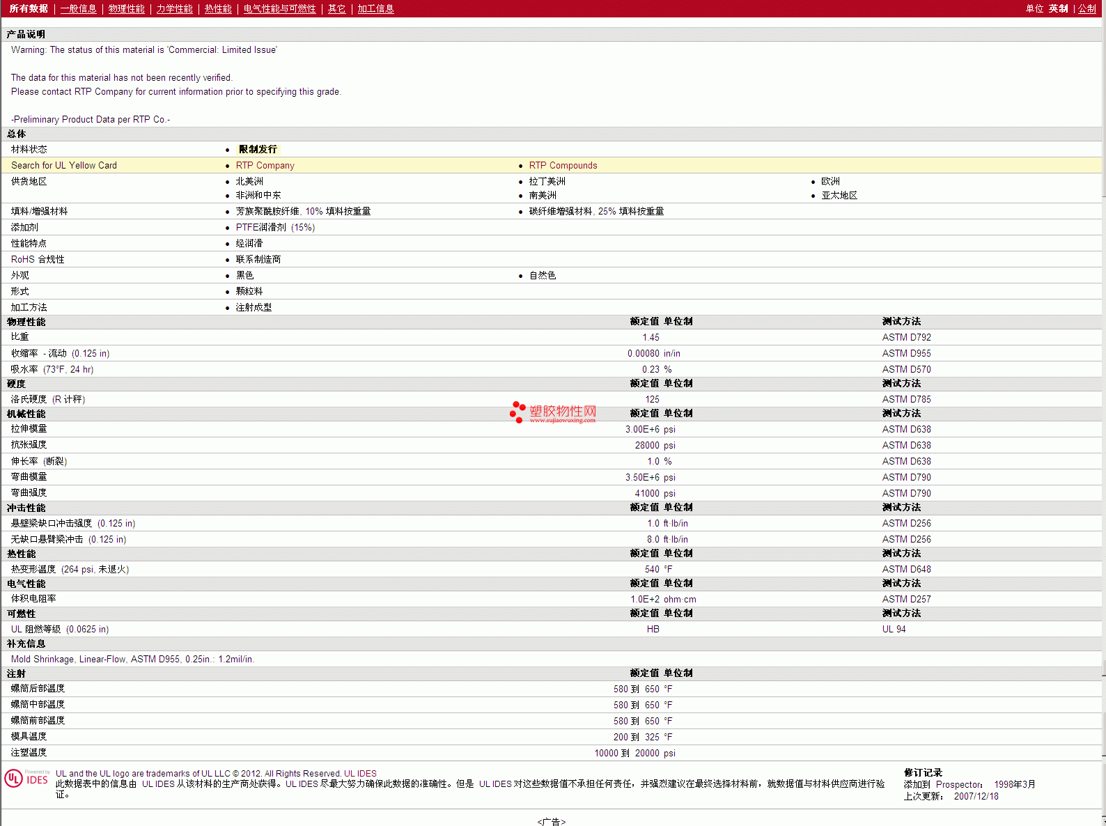 需了解RTP Compounds PTFE 4084 AR 10 TFE 15 物性表更多详情,材质证明、ROHS(SGS)报告、物质安全资料表(MSDS)、UL黄卡等,最新行情报价等可来电咨询:赵先生:13424755533或QQ: 27660005