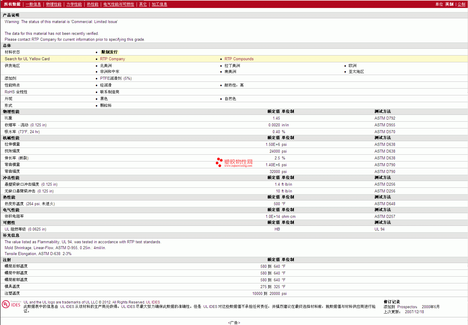 如需了解RTP Compounds PTFE 4405 TFE 5 物性表更多详情,ROHS(SGS)报告、物质安全资料表(MSDS)、材质证明、UL黄卡等,最新行情报价等可来电咨询:赵先生:13424755533或QQ: 27660005