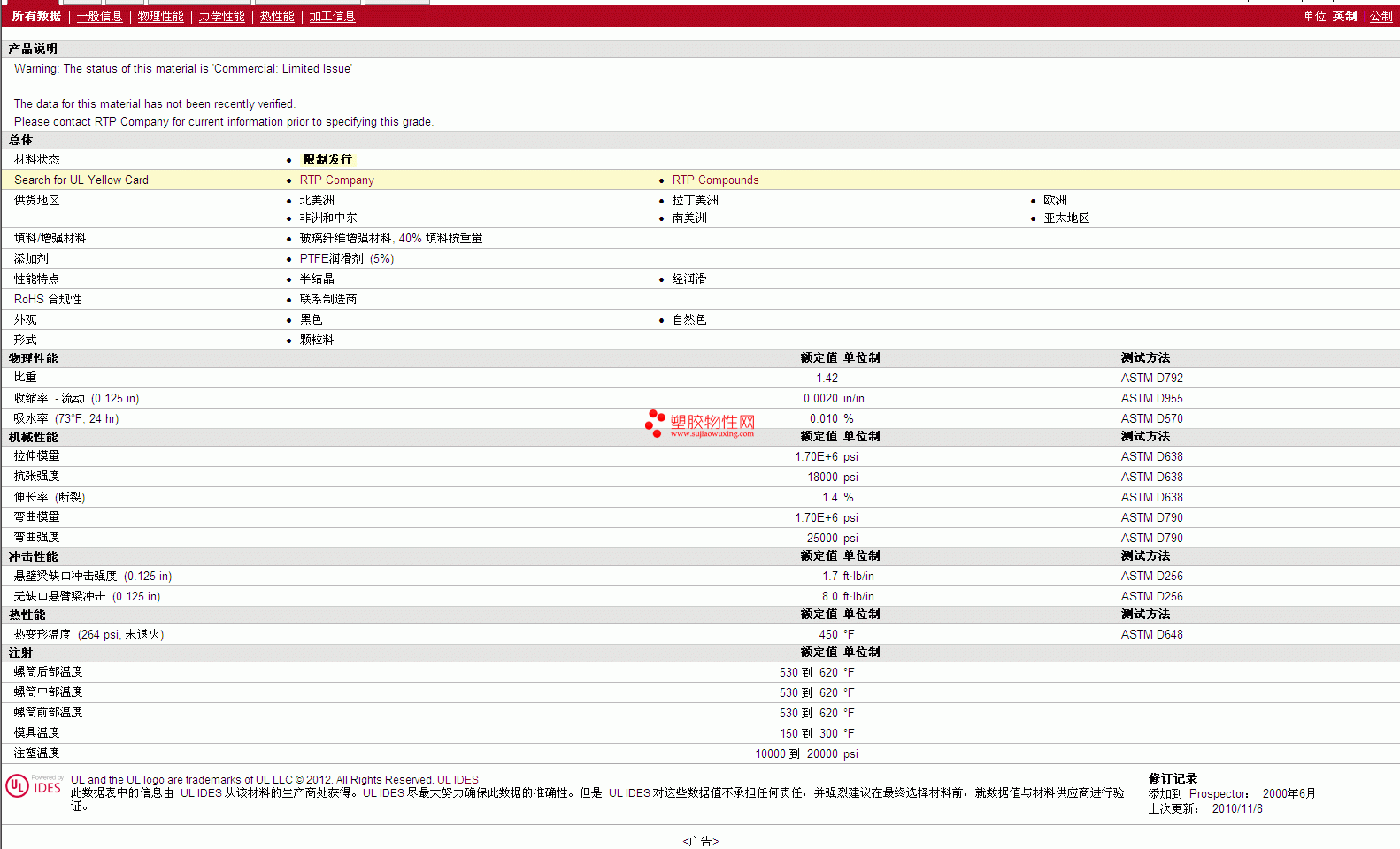 如需了解RTP Compounds PTFE 4607 TFE 5 物性表更多详情,ROHS(SGS)报告、物质安全资料表(MSDS)、材质证明、UL黄卡等,最新行情报价等可来电咨询:赵先生:13424755533或QQ: 27660005